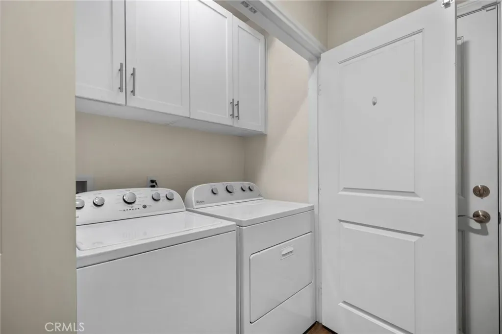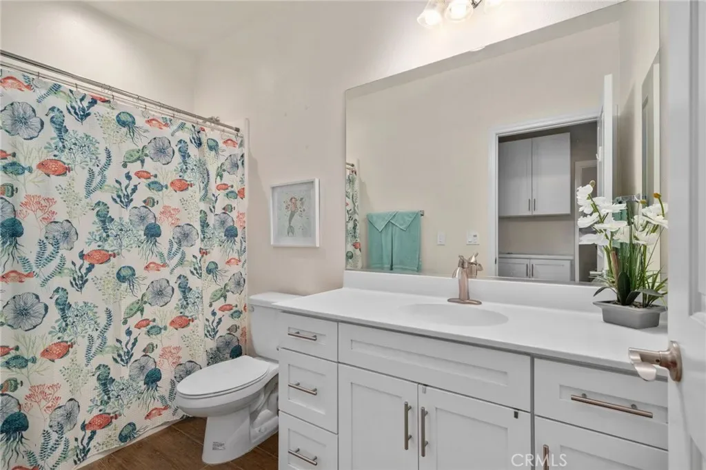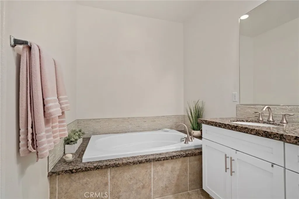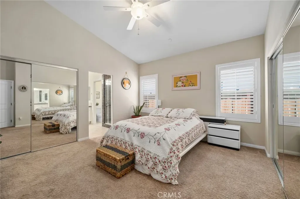 The primary suite is generously sized and includes plantation shutters, a ceiling fan, mirrored closet doors, and dual closets. The en-suite bathroom features dual sinks with granite counters, a large soaking tub, and a separate walk-in shower. The secondary bedroom is equally inviting with plantation shutters, a ceiling fan, and mirrored closet doors. A second full bathroom and a dedicated laundry closet with built-in cabinetry add to the home’s convenience.