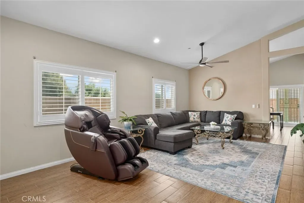 The front exterior is fully concrete for easy upkeep and features a cozy covered porch and inviting double-door entry. Inside, you’ll find a convenient coat closet with double doors, leading into a bright and airy family room complete with a ceiling fan and elegant plantation shutters.