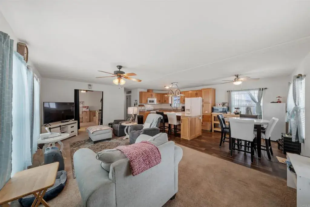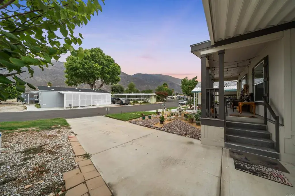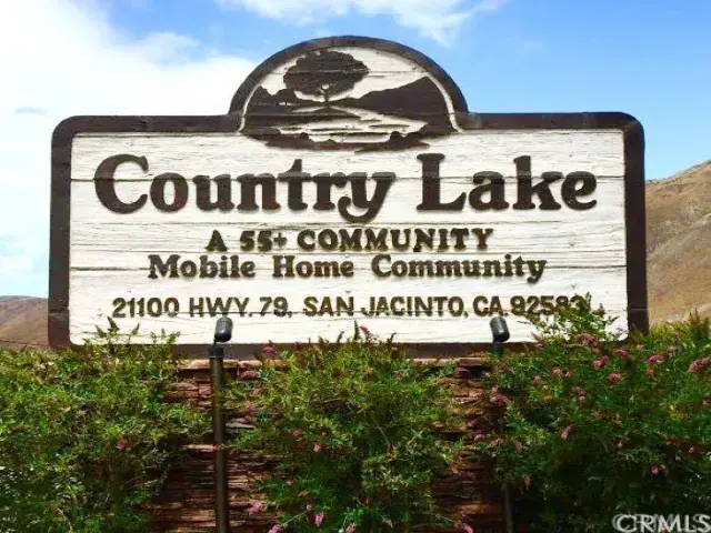 Country Lake, Mobil Home Community is know as the best in San Jacinto. It is a 55+ community * Leased Solar panels. Build 2018, 1397 sqft. total 3 bdrms, one of the bedroom is use as a den, office. It has an amazing open floor plan features a large kitchen appliances included, kitchen with an enormous breakfast bar and ample storage. Oak-aged linoleum flooring dining room. A generously sized master bedroom. This home is landscaped with an irrigation system, oversized driveway, and two sheds/workshops, and a fairly good size backyard for your BBQ and pets. Additional guest parking. per park manager must be prequalified. and ok for 18 yrs child. Motivated sellers.