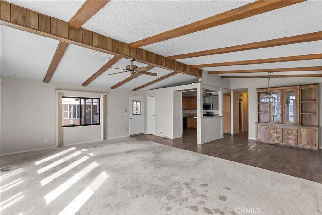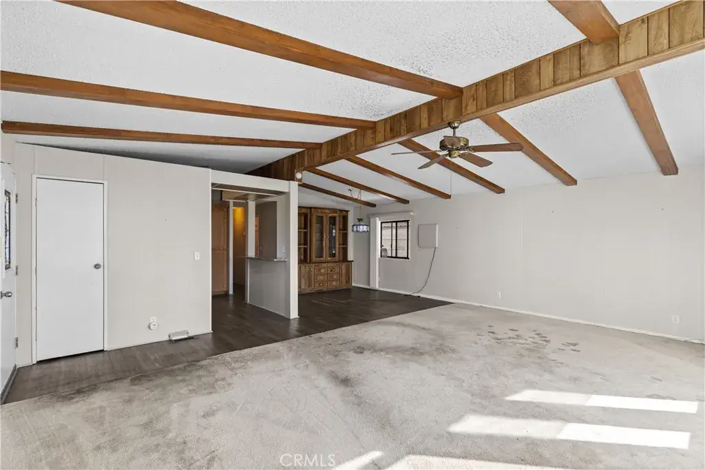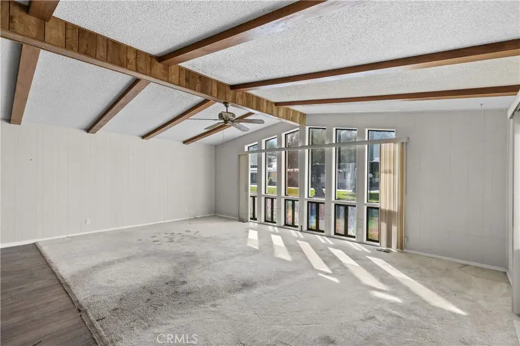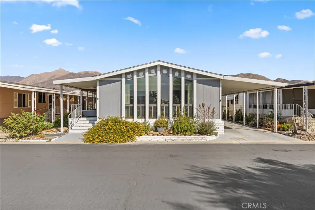 OWNER MAY CARRY NOTE! Located in the 55+ Soboba Springs at Lake Park community, this 2-bed, 2-bath home offers space, light, and plenty of opportunity to make it your own. The living room features an eye-catching A-frame window wall and vaulted ceilings with exposed beams that bring in great natural light. The kitchen provides ample cabinet space and updated stainless steel appliances, while the primary suite includes a walk-in shower and soaking tub. Enjoy the enclosed Arizona room, perfect for relaxing in this peaceful neighborhood. Additional highlights include a evaporative cooler, storage shed with a workbench, and extra storage space behind the home. Community amenities include a pond, clubhouse, and friendly neighbors, all set in a quiet San Jacinto location.
