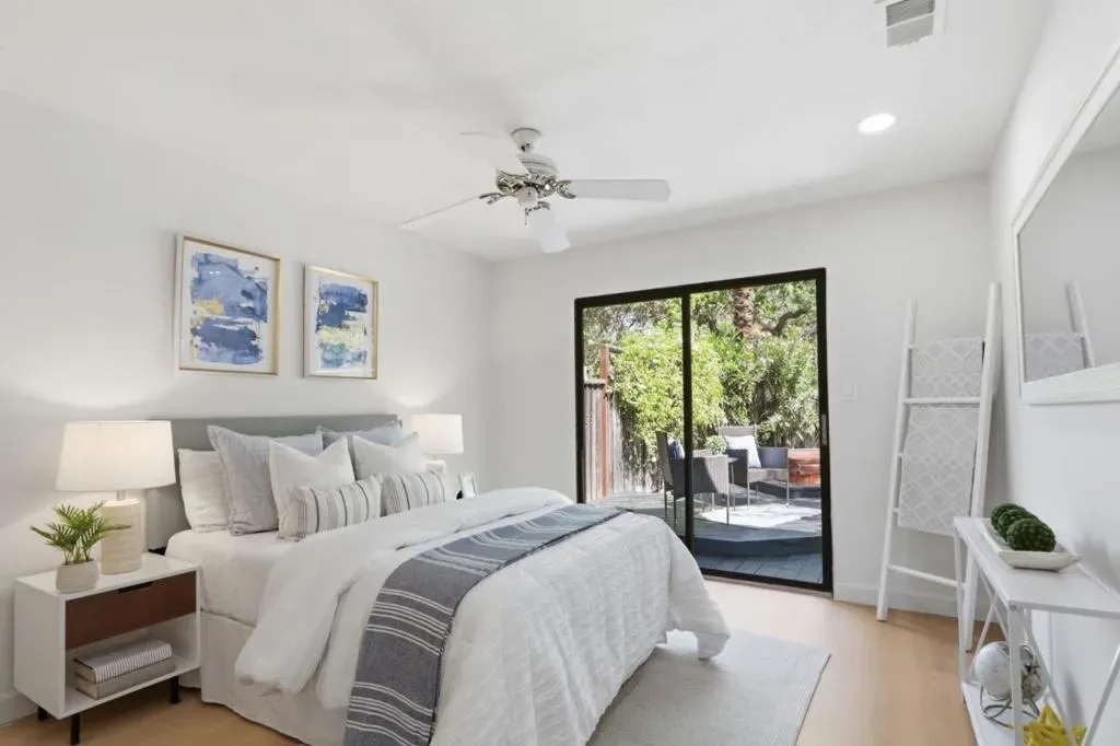 Beautifully updated home with two ground floor bedrooms offering a stylish living space on one of the larger parcels in the neighborhood. Stunning Japanese maple, roses, and lush greenery. New luxury vinyl plank flooring throughout, soaring ceilings, abundant natural light, and a warm, inviting living room anchored by a charming wood-burning fireplace and a picturesque bay window. The chefs kitchen shines with quartz slab countertops, mosaic tile backsplash, striking two-tone cabinetry, stainless steel appliances, and a garden window overlooking the yard. The flexible floor plan includes two ground-level bedrooms with recessed lighting and backyard access, plus an upstairs primary retreat with walk-in closet and updated en suite bath. Additional amenities include solar, central A/C, attached 1-car garage with built-in cabinetry, laundry area, The private backyard backs to wooded views and is designed for relaxation and entertaining with a covered brick patio, wood deck, hot tub, mature landscaping, fruit trees. Ideally located near parks, trails, and top-rated schools. Walkable to Alamitos Creek trail and Mockingbird entrance to Quicksilver Park. Graystone, Bret Harte Middle, Leland High.
