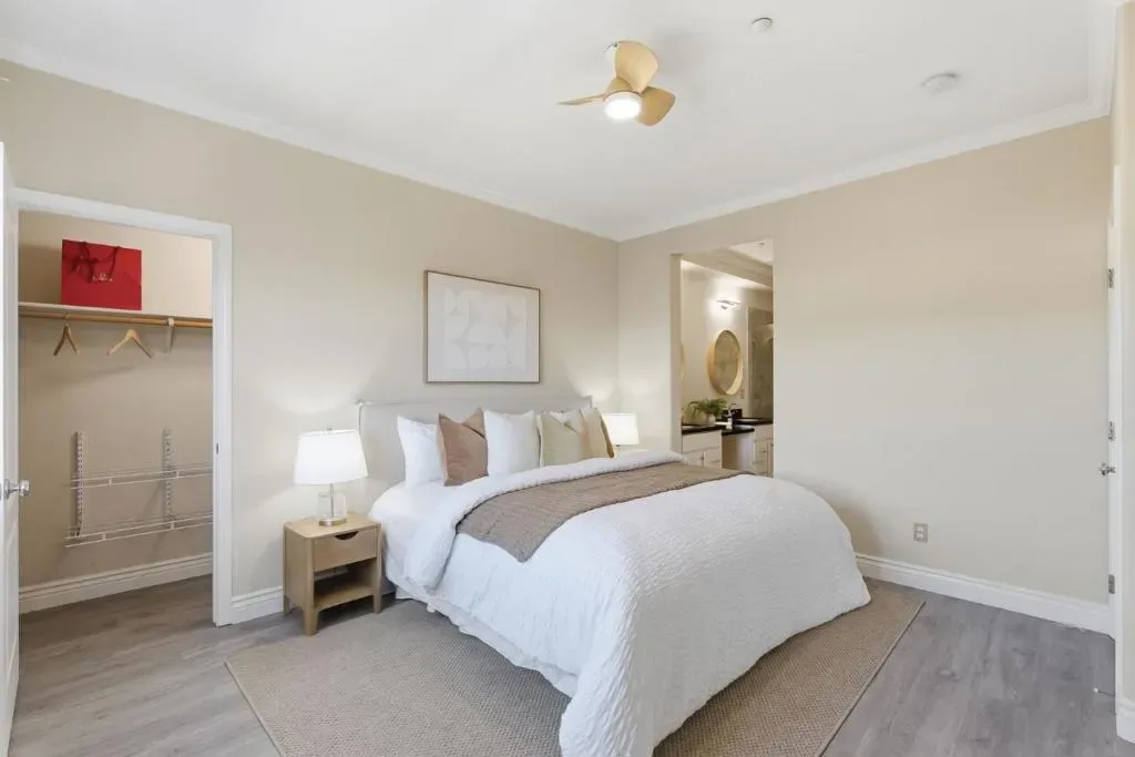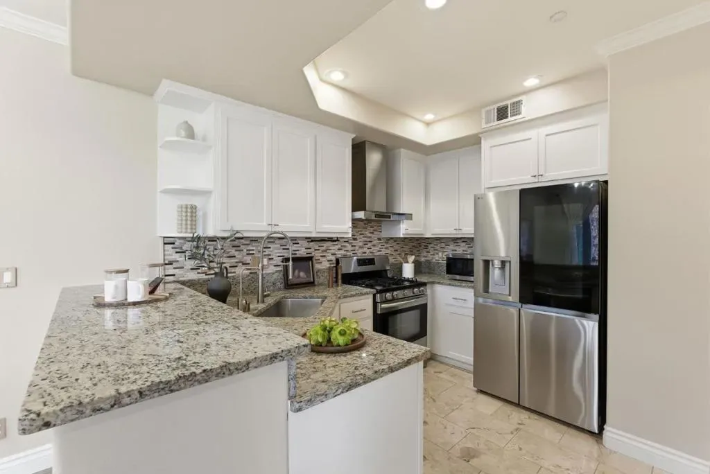 Welcome to this well-loved 2-bed, 2.5-bath townhome in the heart of North San Jose! A beautiful entry welcomes you with a natural stone accent wall and elegant marble flooring. The bright living room is filled with natural light and flows seamlessly into the kitchen and dining area. A large sliding door opens to a spacious patio with spring blooms and peaceful greenbelt views. Customized blinds and soft cotton curtains allow natural light to filter through while maintaining privacy, creating a relaxing Zen-inspired atmosphere complemented by light oak wall shelving. The gourmet kitchen features granite countertops with a full tile backsplash, a breakfast bar, and high-end appliances including a Samsung range oven and dishwasher, LG smart refrigerator, Samsung washer and dryer, and a powerful range hood, perfect for everyday cooking and entertaining. Two bedroom suites are located on the top floor, offering privacy and comfort for both owners and guests. The spacious primary suite includes two walk-in closets and an updated bathroom with double vanities and marble flooring. Prime location within walking distance to Costco, Ranch 99, parks, and golf courses. Close to restaurants, shopping, and easy access to Hwy 880 and 680, with convenient commuting via VTA and BART.