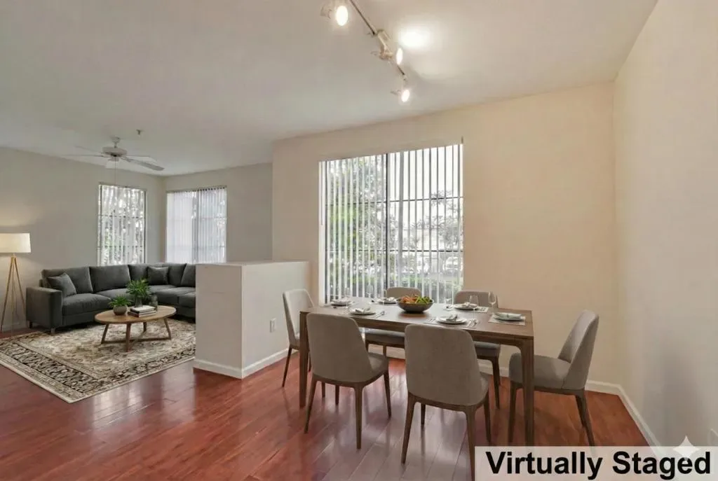 Urban energy meets modern comfort in this beautifully designed 2-bedroom, 2-bath condo near the heart of downtown San Jose. Step inside to discover soaring ceilings, sun-splashed interiors, and rich laminate flooring that adds warmth and style throughout. The open-concept kitchen is a standout with dark wood cabinetry, granite countertops, and sleek, modern finishes. The spacious primary suite includes a private bath and a generous walk-in closet. A built-in desk nook offers the perfect space to work from home or study. In-unit laundry, an extra storage unit, and access to community perks including a fitness center, pool, spa, BBQ area, conference room, and garden seating elevate everyday living. Standard sale (not REO). Responsive seller, clean disclosures, smooth escrow. Located minutes from San Jose State, SAP Center, local dining, nightlife, and easy freeway access, this move-in ready condo blends comfort, location, and low-maintenance living in one unbeatable package.