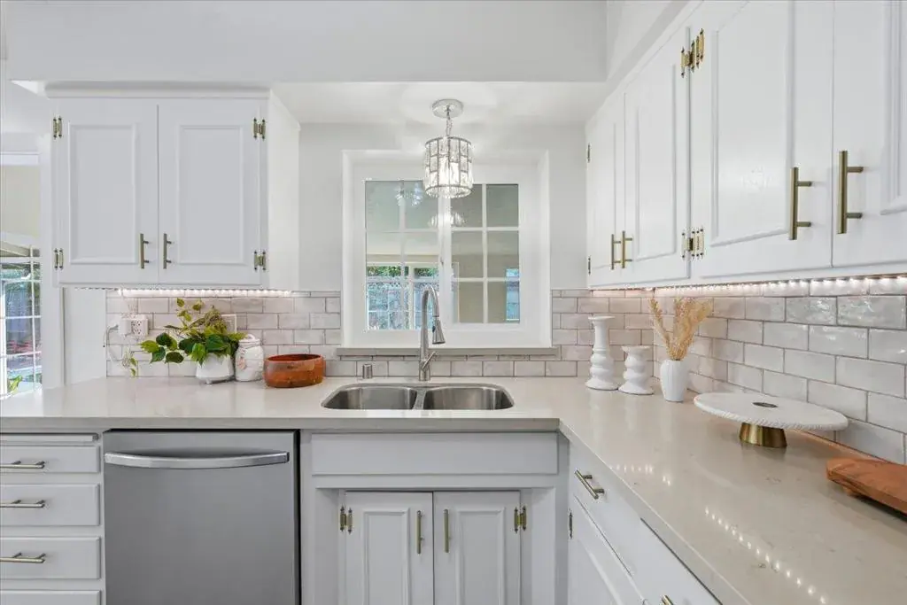 Step into a world of modern elegance in this beautifully appointed residence, where an open-concept design and airy light wood flooring create a bright, seamless flow for daily living. The heart of the home is the sophisticated kitchen, meticulously designed with crisp white Shaker cabinetry, a textured tile backsplash, and a stainless steel gas range with a professional vent hood. An expansive center island, illuminated by chic pendant lighting, offers a breakfast bar that serves as the perfect gathering spot for entertaining. Private quarters are equally impressive, highlighted by a grand primary suite that features a graceful arched entry and a dedicated sitting area, offering a true retreat within the home. The spa-inspired bathrooms showcase modern luxury with double vanities, sleek integrated sinks, stone-look countertops, and expansive wall-to-wall mirrors. enhanced by a versatile home office and recessed lighting throughout, this home combines style and function in a quiet, established neighborhood near top-rated schools and shopping.