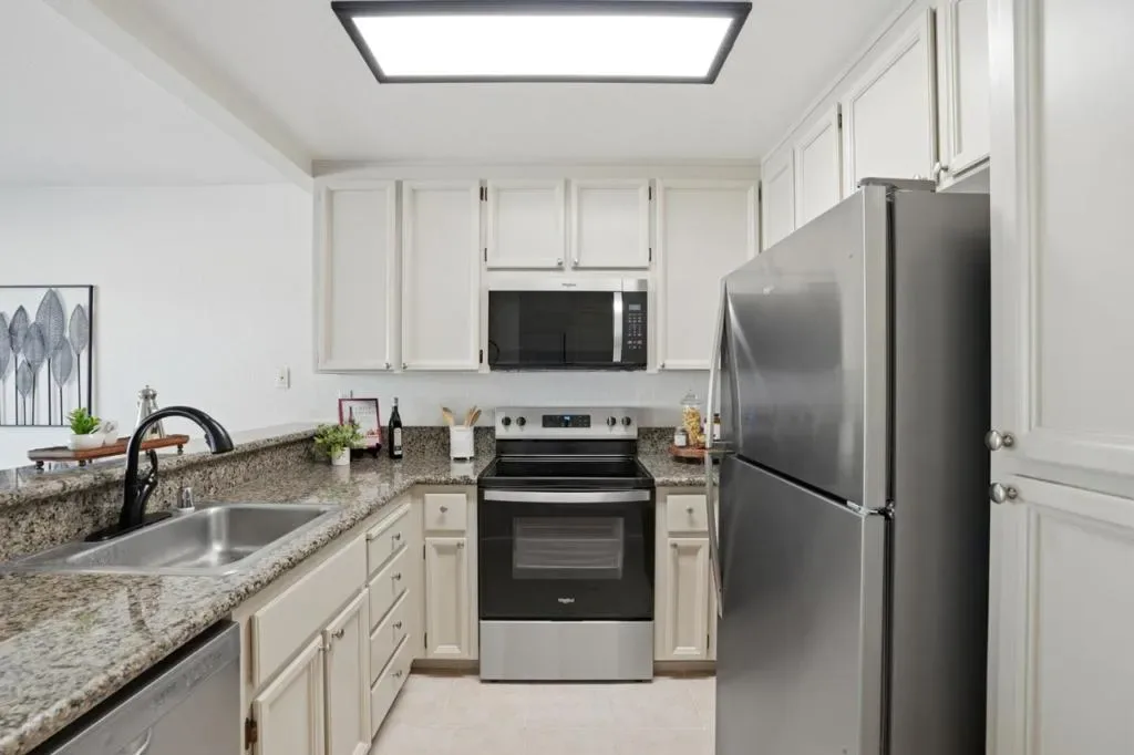Lakeview Terrace offers ponds, fountains, and winding pathways that create a rare retreat just minutes from city life. This is one of the few units with a direct, unobstructed pond view – overlooking open water instead of carports, streets, or neighboring buildings. From your second-story private balcony, watch ducks glide across the pond, listen to the fountains, or unwind under the evening sky. Location is what sets this 2-bedroom, 1-bath home apart within the community. Inside features include new HOA-approved luxury vinyl plank flooring, all-new kitchen appliances, indoor laundry with washer and dryer included, central air conditioning, and a storage closet off the balcony. One assigned parking space and ample guest parking are included. A rare opportunity to own one of the communitys most desirable pond-view locations.