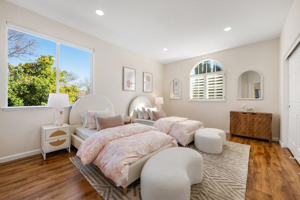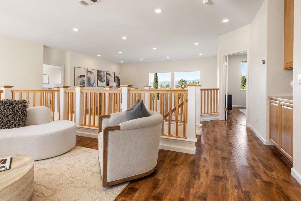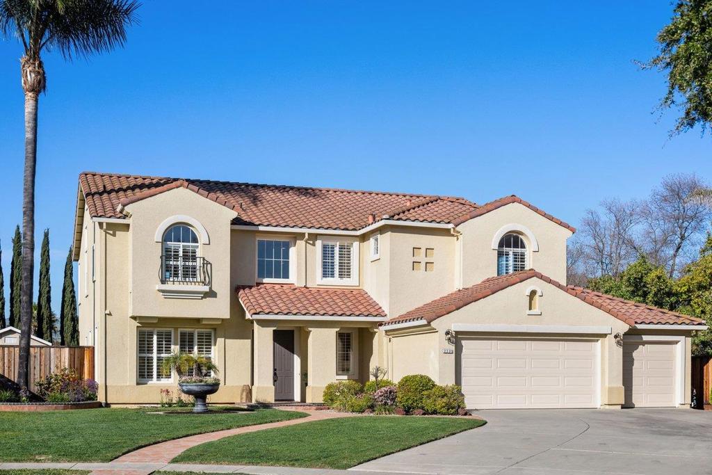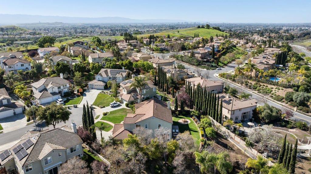 Mediterranean-style home on a serene cul-de-sac in Silver Creek Valley, enjoying sweeping panoramic hill views from multiple vantage points throughout the home. Offering 4 spacious bedrooms plus a versatile loft easily becoming a 5th bedroom (original builder option, bathroom already in place), 4 full bathrooms and ~3,420 sq ft of living space. Expansive windows and soaring ceilings fill the entire home with natural light. Main level bedroom and full bath. Elegant layout with separate living and dining rooms, plus open-concept family and kitchen areas. An architectural bridge upstairs creates a striking vantage point and privacy between the primary suite and other bedrooms. The well-appointed kitchen features a central island, abundant cabinetry and walk-in pantry. Spectacular backyard on a generous ~0.33 acre lot combines privacy, magnificent views, wraparound paver terraces, lush lawn and fruit orchard – an extraordinary setting for outdoor living and celebrations. Additional structure has flexible use as storage, workshop or studio space. 3-car garage and long driveway for multiple cars. Short walk to highly rated JFS Elementary. Enjoy the scenic Evergreen hills with endless walking and biking routes just outside your door. Quick access to Hwy 101. No HOA dues.
