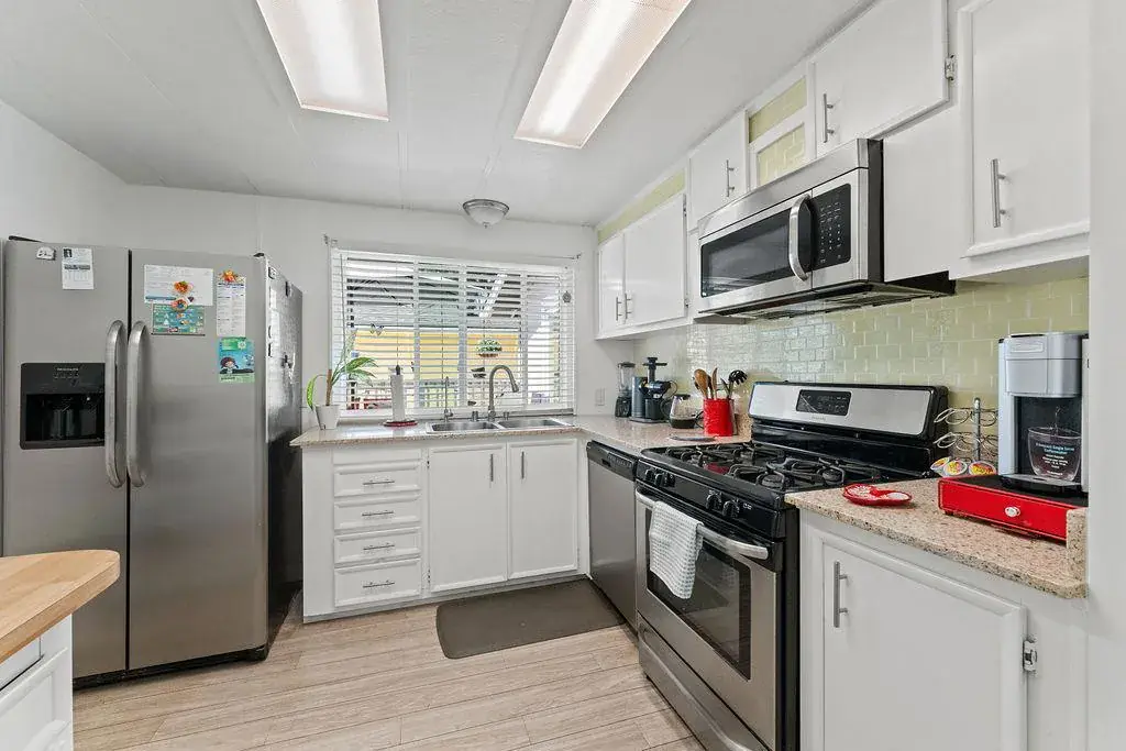 This mobile home is calling your name. Welcome to Mountain Springs a premier mature adult mobile home community. Purchaser must be owner occupied, no sub-leasing, one buyer age 55+, and no permanent resident under 18. The community maintains the front yard. Situated in a quiet corner with no neighbors on one side & no one in front. Beautiful view to mountains and ducks in the creek. Two-car attached garage + room to park in front & near guest parking. Behind your private fence yard, relax and rest patio or raised deck, while enjoying a competitive game on your own private bocce ball court. . Meander inside taking in the high ceilings, recess lights, and double-pane windows. Luxury laminated floors, granite countertops, stainless steel appliances, gas range, central a/c, and generously sized rooms. The oversized indoor laundry room also offers a desk space also enjoy your remodeled garage with epoxy floor. In 2024 lighting and plumbing were updated. So much to offer for an affordable home in Silicon Valley.
