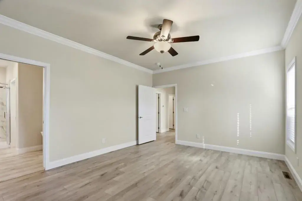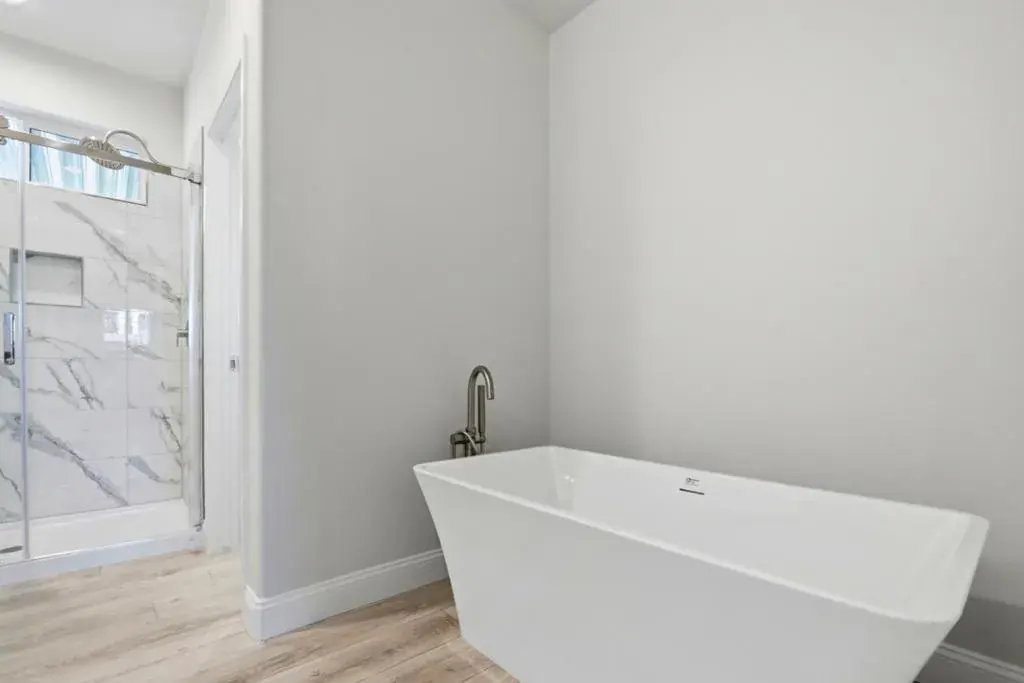 This beautifully designed home features an open floor plan with a bright and airy living room. It includes 9-foot tray ceilings, recessed lighting, a ceiling fan, and an electric fireplace for added warmth and ambiance. The spacious kitchen boasts white quartz countertops, stainless steel appliances, and elegant white cabinetry, making it perfect for family meals or entertaining guests. Each of the three large bedrooms offers generous closet space, while the luxurious primary suite features dual sinks, a freestanding soaking tub, a step-in shower, and a private water closet for added convenience. Additional highlights include a large laundry room and practical living spaces throughout the home. Situated in a prime area with highly rated schools, this home is an ideal choice for anyone seeking a peaceful, comfortable, and affordable lifestyle.