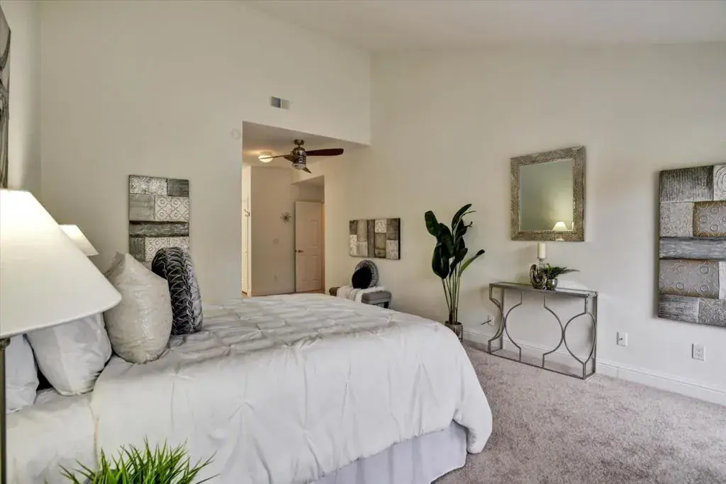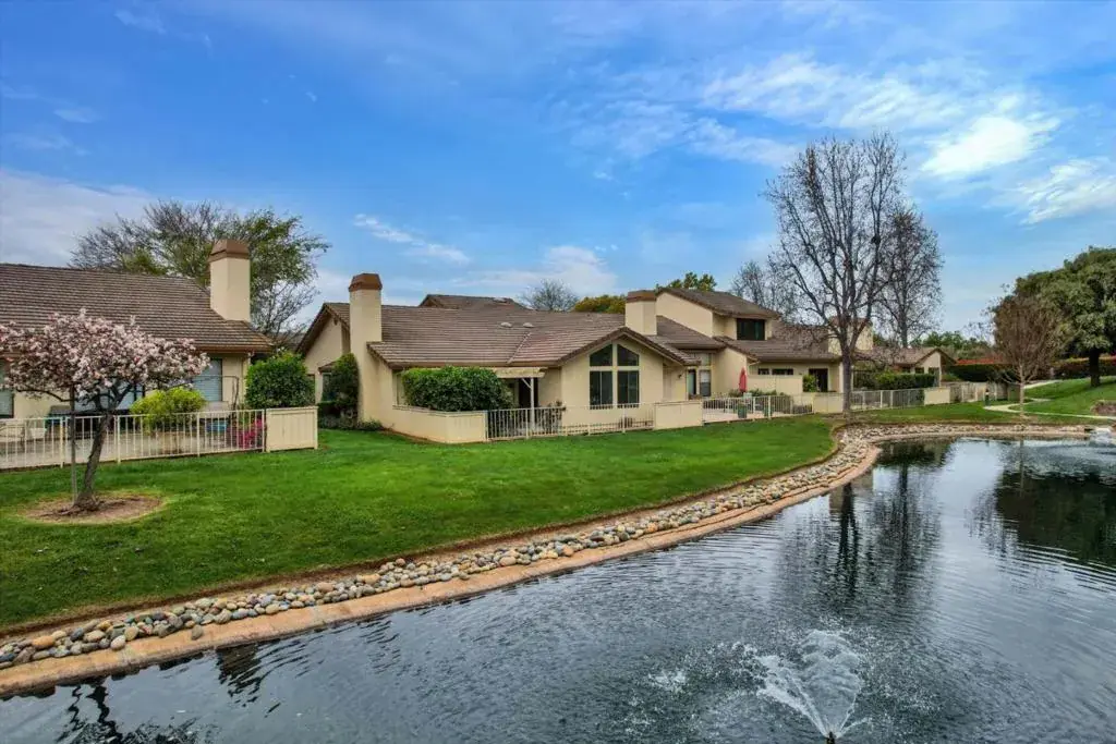 Welcome to resort-style active living in the highly sought-after, gated 55+ community of The Villages Golf & Country Club. SINGLE LEVEL! END UNIT, BACKYARD POND VIEWS Home! In the Village Del Lago neighborhood. Enjoy a tranquil setting with a manicured emerald green landscape throughout the community. Soaring high ceiling in dining room & kitchen dining area with bright skylights. Quartz countertops, electric stove, new laminate flooring, newly painted, breakfast bar, new cushioned carpet in bedrooms, double door main bedroom,ceiling fan, private main bedroom cozy patio, large soaking tub with dual sink. Central heater & air conditioner. Enjoy serene relaxing backyard patio pond views in the morning with polished lush green plants that provide both shade & privacy including a rustic overhang. Direct access from Garage to House. Comfortably can accommodate 2 Cars with easy accessible additional guest parking just steps away & main clubhouse is also just a couple minutes walking distance from the home. Enjoy the exceptional amenities which include 24-hour security gate, golf courses, social clubs, pickleball, tennis, bocce, swimming pools & much more! Resort living in the heart of Silicon Valley for active adults. Future buyers to verify any additions/permits with City of San Jose.