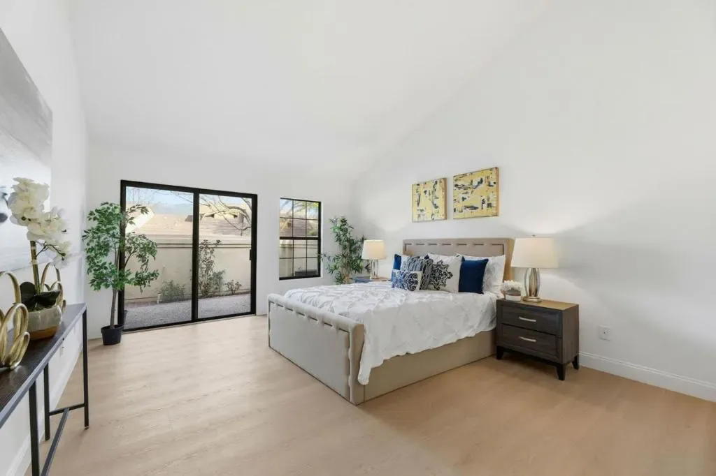 Recently remodeled single level end unit in an active senior community. One person must be 55+. Step through the front door to this open, spacious floorplan with high ceilings and impressive formal dining room with a custom lighted china cabinet and suntunnels for natural light. The cozy living room features a fireplace and a sliding door to the large rear patio for outdoor entertaining. The updated kitchen is just off the living room and dining room and features quartz counters, custom painted cabinets with pull out shelves, newer stainless steel appliances, and recessed lighting. New vinyl plank flooring and fresh paint throughout. The primary suite features a huge bedroom with sliding doors out to a private patio, walk-in closet, dual sinks, linen closet and vanity area, and stall shower with a new shower door. The den can easily be converted to a 3rd bedroom just by adding closet doors in front of the niche. The second bedroom is light and bright and features wall to wall closets with mirrored closet doors. Inside laundry and attached 2 car garage provide added convenience. This property is move-in ready. Must see!