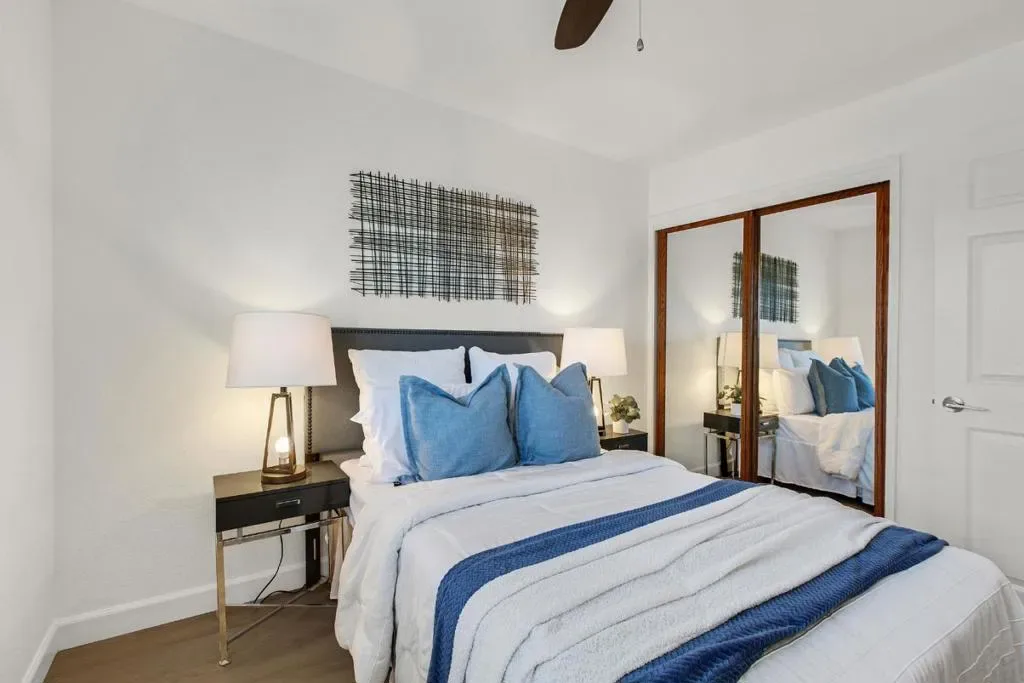 Exceptional 2-bedroom, 2-bathroom condominium in a premier complex location featuring fresh new vinyl flooring, paint, light fixtures, blinds, and dual-pane windows throughout. Top floor corner unit. Bedrooms offer mountain views, vaulted ceilings, ceiling fans, and abundant storage, complemented by in-unit laundry with washer and dryer included. The living room showcases an updated modern fireplace, while the kitchen provides ample cabinets, a new range, and generous counter space all supported by a new wall heater and water heater for optimal efficiency. Ideal parking includes 1-car garage parking plus assigned carport, with community amenities featuring a pool, clubhouse, and beautifully maintained grounds. Conveniently located near Highways 101, 280, and 680 for seamless Bay Area access. Minutes away from SJSU, SJC airport, downtown San Jose.