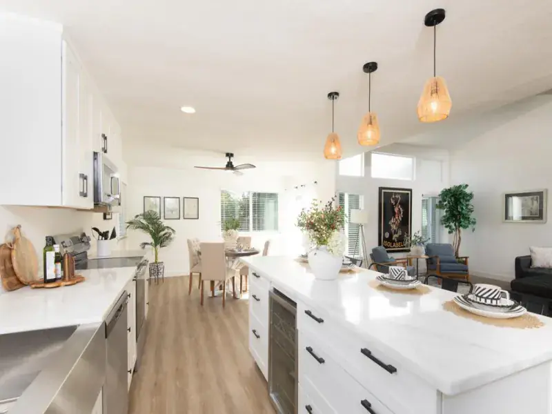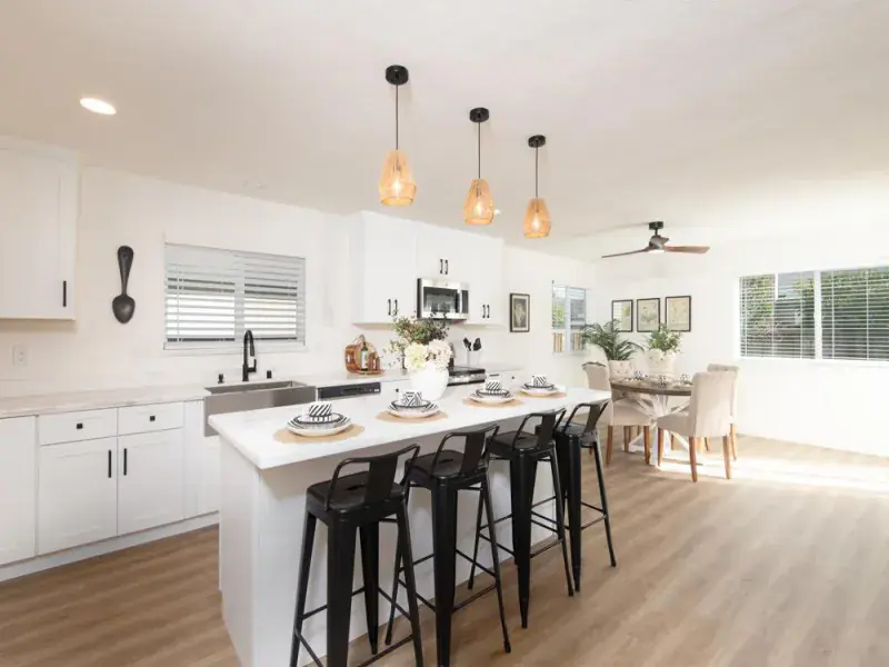 This beautiful home was purchased out of probate and thoughtfully refurbished. As only the second owner the finishes were selected with quality and functionality in mind. The kitchen is light and bright with quartz countertops, matte black hardware, and GE appliances.The large 8 foot island is complete with a wine fridge and is a perfect place to entertain. Interior and exterior paint create a clean, modern feel, complemented by stylish luxury vinyl flooring throughout the main living areas and elegant tile in the beautiful bathrooms. The home features dual-pane windows and Solar power for enhanced energy efficiency and comfort. Both the front and rear yards are landscaped with inviting outdoor spaces framed by mature fruit trees that add charm and character to the property. A standout feature is the self-contained fourth bedroom, complete with its own laundry and kitchen facilities ideal for extended family, guests, or potential rental income. With its blend of tasteful upgrades, versatile living options, additional parking, and finished 2 car garage that is provides move-in-ready condition. This home offers exceptional value and flexibility for today’s buyer.