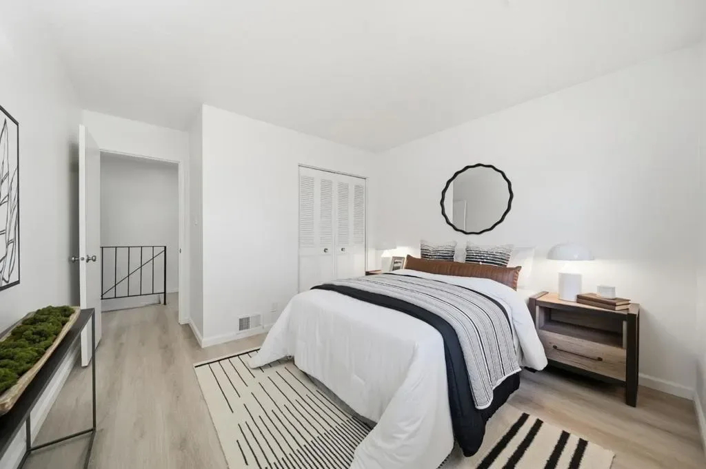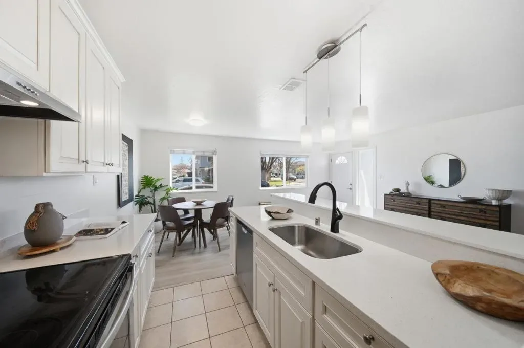 This beautifully remodeled corner-unit home offers peace and seclusion with no neighbors above or below. The thoughtfully designed layout features a private side entrance leading into an expansive lower-level floor plan, perfect for both relaxing and entertaining. Inside, the home boasts energy-efficient dual-pane windows and upgraded laminate flooring throughout the main living areas, while the staircase is finished with upgraded carpeting. The modern kitchen shines with crisp white cabinetry, elegant quartz countertops, and a full suite of included stainless steel appliances, including an electric range, dishwasher, and an upgraded refrigerator. Upstairs, you will find two spacious bedrooms flooded with natural light and a refreshed bathroom featuring an upgraded vanity and contemporary lighting. Beyond the interior, the property includes a dedicated patio for outdoor enjoyment and a convenient one-car shared garage, all perfectly situated just steps from the community pool and other amenities. This home offers a convenient location close to major freeways, a variety of dining and shopping options, and nearby local parks, making it an ideal place to call home.