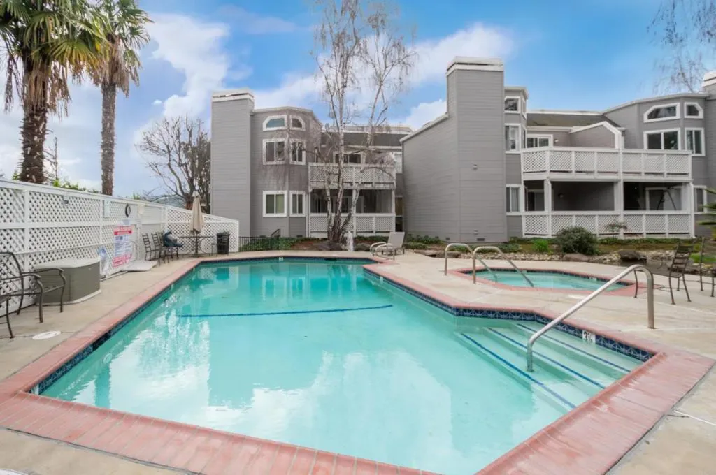 An incredible chance to own this charming condo in serene Lakeside Commons. This two-story home offers 2 bedrooms, 2 bathrooms, and 1,212 SF of living space on a 1,980 SF lot. External stairs lead to a deck entrance opening to a bright, airy floorplan. The interior boasts new paint and flooring, while the spacious living room is filled with natural light through dual-pane windows. The recessed lighting and electric fireplace create a cozy atmosphere. The semi-open kitchen has modern appliances including brand new refrigerator, granite countertops, and a dining area with built-in cabinets. Sliding doors open to a balcony overlooking the pool. First floor also offers a bedroom, bath, and laundry with a washer/dryer. Upstairs features a bedroom with a closet, en-suite bathroom with a standing shower, tiled walls, and a vanity. Additional amenities: 1-car garage, designated carport, pool, spa, gardens, ponds, guest parking. Located in desirable Cambrian Park, very close to Los Gatos downtown with San Jose prices. Walking distance to top schools such as Carlton/Union/Leigh. Nearby Norman Y. Mineta Highway, parks and hospitals provided convenient commuting and living.