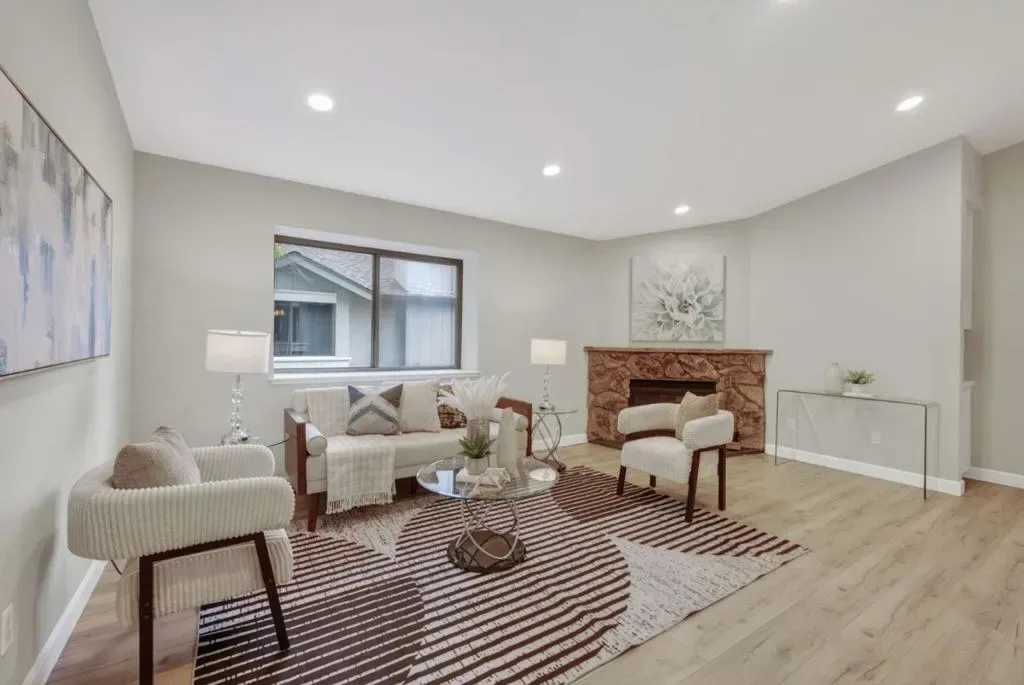 Centrally located in San Jose’s Silicon Valley, walking distance to Santana Row and Valley Fair mall, as well easy access to highway arteries and tech companies nearby. This condo is spacious with high living room ceilings and an open floor plan. Ample privacy on your serene balcony with views of luscious trees sitting on a corner unit. The kitchen is equipped with quartz countertops, an electric cooktop, oven range, microwave, refrigerator, dishwasher, garbage disposal, and exhaust fan, and opens up to a combined kitchen and family room area. Freshly painted interior and gorgeous flooring to match. The living space includes a cozy fireplace and a dining area near the kitchen. Comfort is maintained year-round with central air conditioning and electric heating. Laundry conveniently located inside the unit, offering a washer and dryer. The property includes a one-car attached garage and is part of a quiet community and neighborhood. HOA VALUE INCLUDES WATER AND GARBAGE.