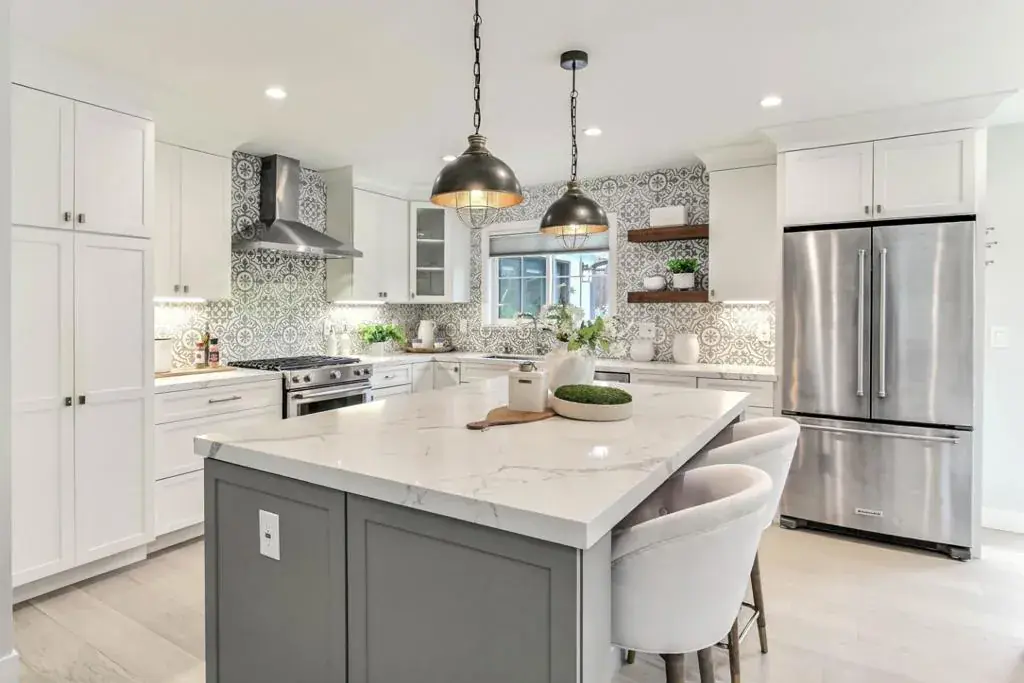 Newly renovated modern farmhouse located near Netflix, Apple Spaceship Campus, Westgate Center, & San Tomas Park, with access to Hwy 85, 280, & Lawrence Expy. Close to Forest Hill Elem., Rolling Hills Middle, & Westmont High. An open floor plan featuring skylights, & recessed lighting. Living area includes a fireplace with custom mantel & Carrara mosaic tile, Milgard dual-pane windows, plantation shutters, & Milgard double French doors. Kitchen includes a large central island, transitional two-tone cabinetry, white shaker-style perimeter cabinets, full-height tile backsplash, under-cabinet lighting, & stainless steel KitchenAid appliances (French-door refrigerator, stove, hood, microwave, dishwasher). Primary bedroom includes a vaulted ceiling, decorative 3D accent wall, large windows, & French door to backyard. Primary bath includes a freestanding soaking tub, frameless glass shower panel, rainfall shower head, two built-in shower niches, full-height textured & linear-pattern tile, skylight, recessed lighting, & integrated ventilation. Hallway bath includes patterned encaustic tile flooring, tub-shower combination, full-height tiled surround, built-in niche, modern vanity, & gold fixtures. Backyard includes a paver patio, level lawn, and raised planter beds.