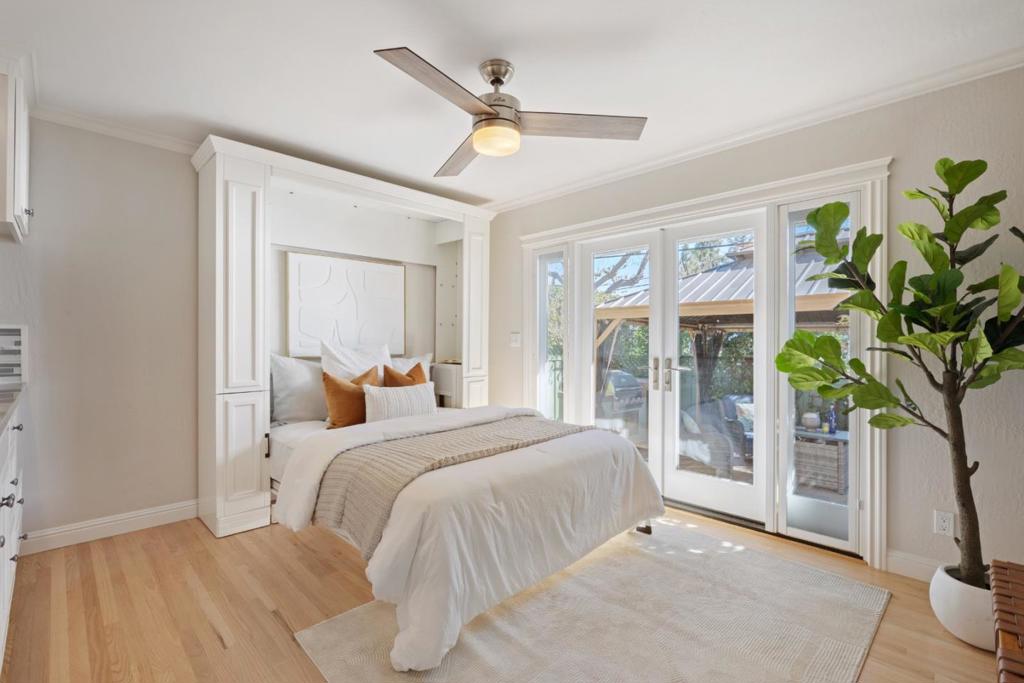 Meticulously updated home designed for everyday living & indoor/outdoor entertaining. Beautiful interior touches include custom cabinetry, solid-core doors, skylights & refinished natural oak hardwood floors. Ground-floor guest suite with Murphy bed, kitchenette & French door access to front courtyard with built in BBQ. Three upstairs bedrooms with ceiling fan/lights & foothill views. Living/dining room features recessed lighting & under-stair pullout cabinets. Step-down family room with gas-log quartz fireplace, natural wood cabinetry & surround sound speakers. Kitchen with cherry cabinets, quartzite counters, stainless-steel sink & appliances. Spacious primary suite with tray ceiling, recessed lights, large walk-in closet & adjoining bath with ceramic tile floor, granite counters, center vanity & walk-in shower. Insulated walls, floors & ceilings; Milgard dual-pane windows; upgraded HVAC (2024); upgraded copper plumbing & electrical; EV charger & new roof (2025) & solar. Backyard with fruit trees, vegetable planters & finished 10×12 shed with ample power outlets and A/C. Epoxy-floor garage with storage loft. Convenient to commuter routes, Lone Hill Park, schools, shopping & dining.