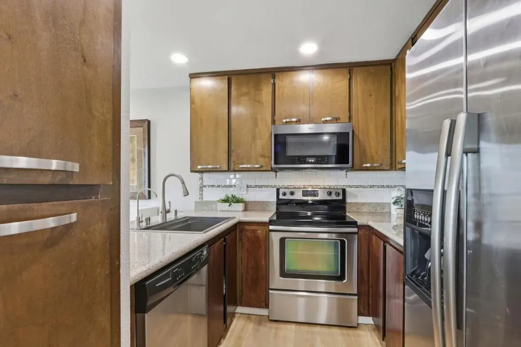 Welcome home to 661 Devlin Court, a must-see 1-bedroom, 1-bath condo offering 720 sq ft of thoughtfully designed living space. This desirable end unit features no neighbors above or below, providing the ultimate living experience rarely found in condos. Step inside to discover an abundance of natural light, beautiful updated flooring, and a spacious living room with a gorgeous electric fireplace feature wall, creating the perfect ambiance. The kitchen boasts stainless steel appliances, granite countertops, and ample storage. Additional highlights include a remodeled bathroom, a dedicated indoor laundry room, newer windows with laminated glass providing excellent sound reduction, recessed lighting, central heating and A/C, a private one-car garage, as well as upgraded insulation, outlets, and smart light switches. Conveniently located near the light rail, Target, grocery stores, restaurants, and shopping, with easy access to Highway 680, this property combines comfort with everyday convenience. Don’t miss a great opportunity to own in this highly sought-after community.