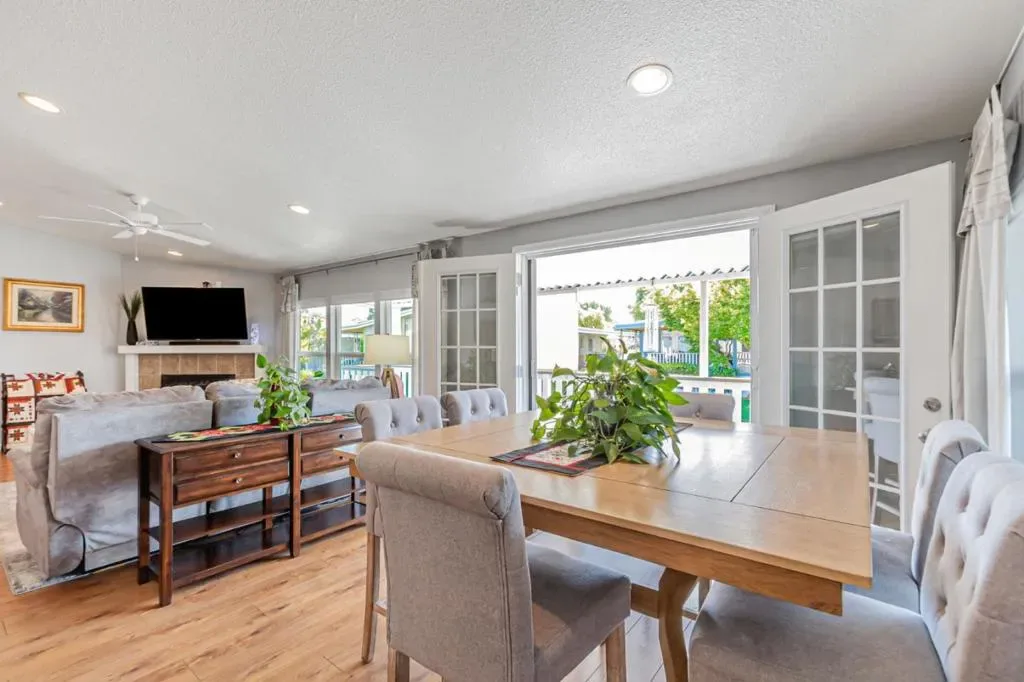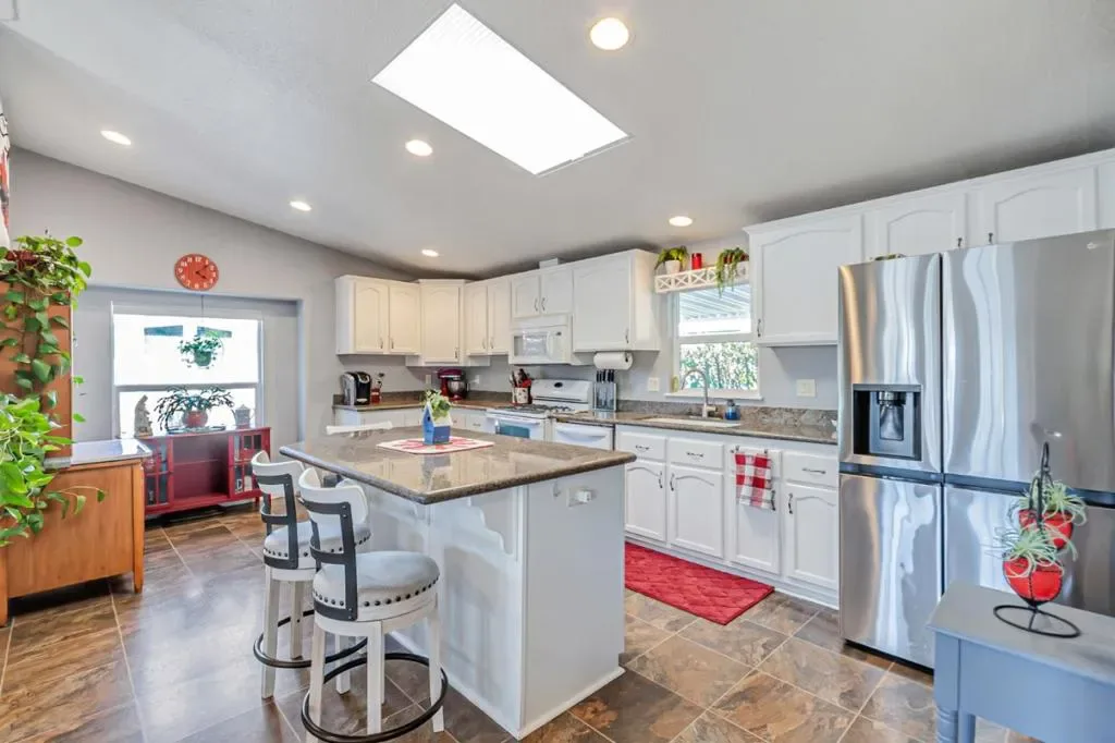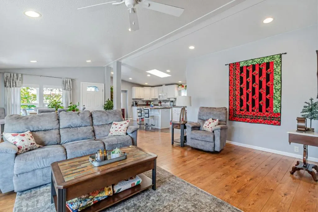 Discover the perfect blend of modern style and effortless living in this meticulously maintained 1644 sq ft manufactured home located in San Jose’s most desirable 55+ senior community. The heart of the residence is a stunning chefs kitchen, featuring a sizeable central island, elegant granite countertops, newer frig and dishwasher, dual oven, and a bright skylight that illuminates the crisp white cabinetry. The beautiful laminate flooring flows seamlessly all through the spacious layout, leading you to a sprawling master suite complete with an oversized bathroom and a generous walk-in closet. A large, dedicated laundry room adds to the home’s practical appeal along with custom UV honeycomb shades throughout and two comfortable guest bedrooms w/ a sleek guest bath . Outside, relax on the durable Trex wrap-around deck, perfect for entertaining guests or sipping coffee. The newer roof, designer exterior paint, roses and mature landscaping that surround the property offer undeniable curb appeal. Love to socialize? Join in on the many planned community dinners and functions, community pool, large clubhouse with ping pong & pool tables, dog park, and community garden. Just blocks from grocery stores, Oakridge Mall, Almaden Lake, and Highways 87 & 85 make this location unbeatable.