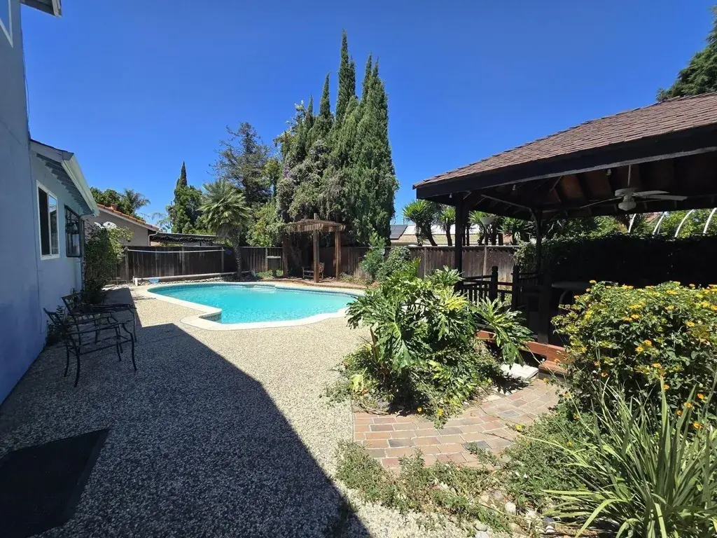 Incredible price for this move-in ready 4 bed, 2.5 bath home in the Edenvale area of San Jose. The spacious living room features soaring vaulted ceilings, rich cherry hardwood floors, and abundant natural light. A formal dining area flows into the updated kitchen with quartz countertops, stainless steel appliances, wine frig and ample cabinet space. Just off the kitchen, the step-down living room includes a stylish wet bar with lighted shelves and a gas fireplace. Upstairs are three comfortable bedrooms plus a enormous primary suite with high vaulted ceilings, dual vanity, new sinks and fixtures, a jetted tub, and a built-in makeup area. Recent upgrades include fresh interior and exterior paint, a newer A/C unit, and a central heating system (2025), new carpet, LVF in all bathrooms, and the removal of popcorn ceilings. The home is energy-efficient with 38 owned solar panels, dual-pane windows. Step outside to a backyard designed for entertaining with a sparkling in-ground pool, a spacious gazebo ideal for games and fun with friends. A separate shaded pergola for poolside lounging. There’s space for your BBQ and a fenced dog run. Located near shopping, restaurants, and Edenvale Garden Park—with easy access to Hwy 101 and Cal train station—