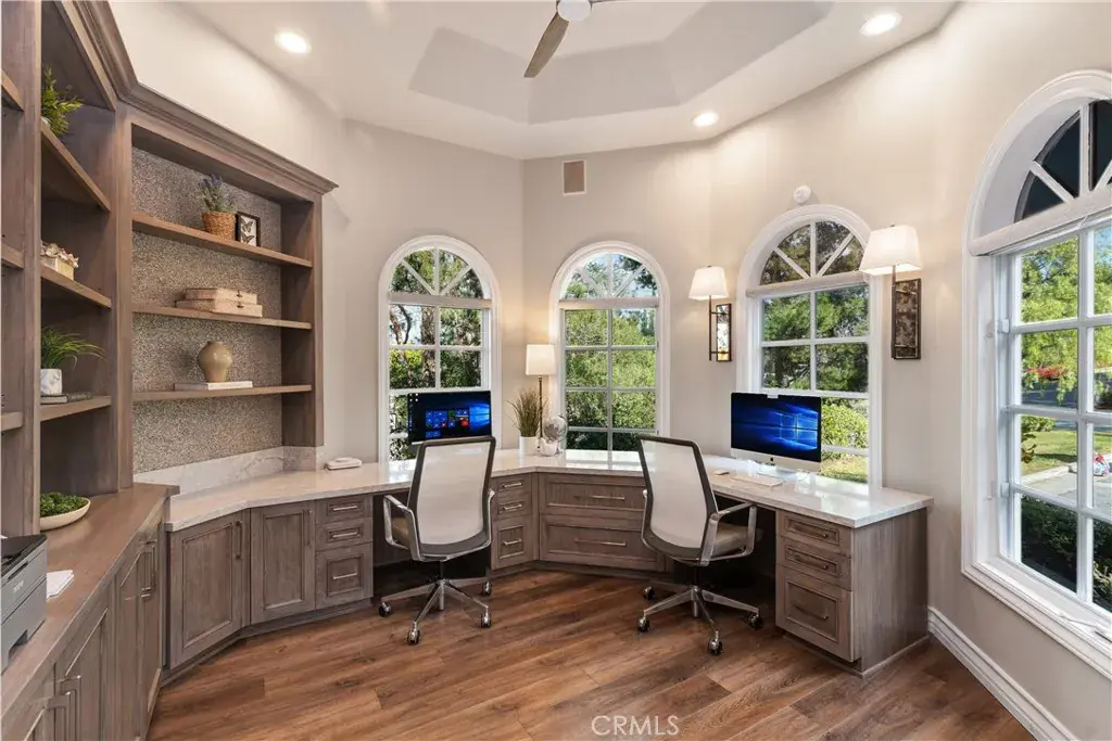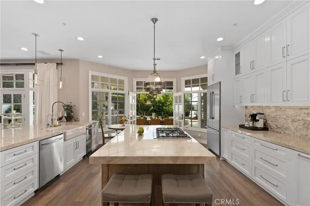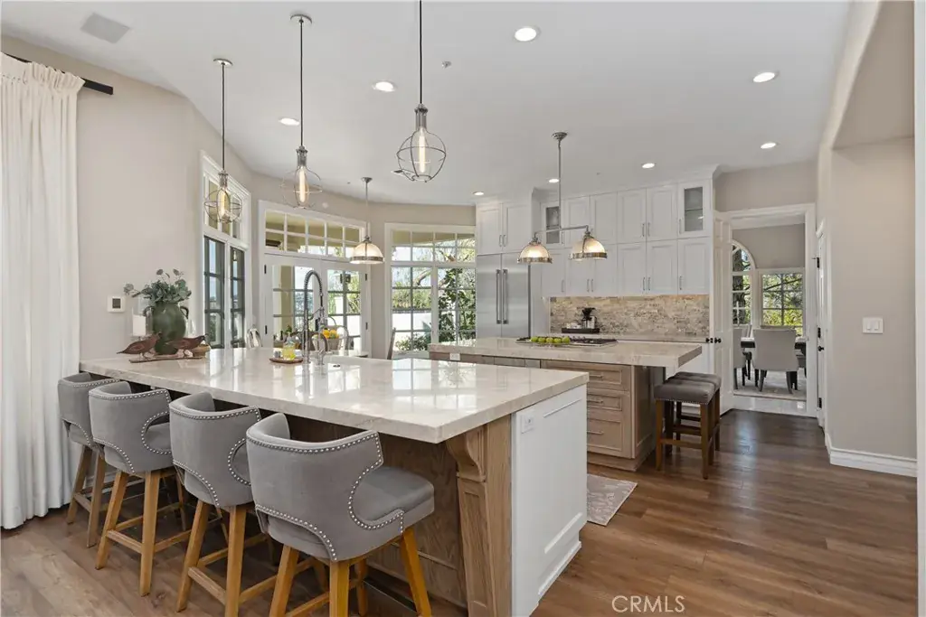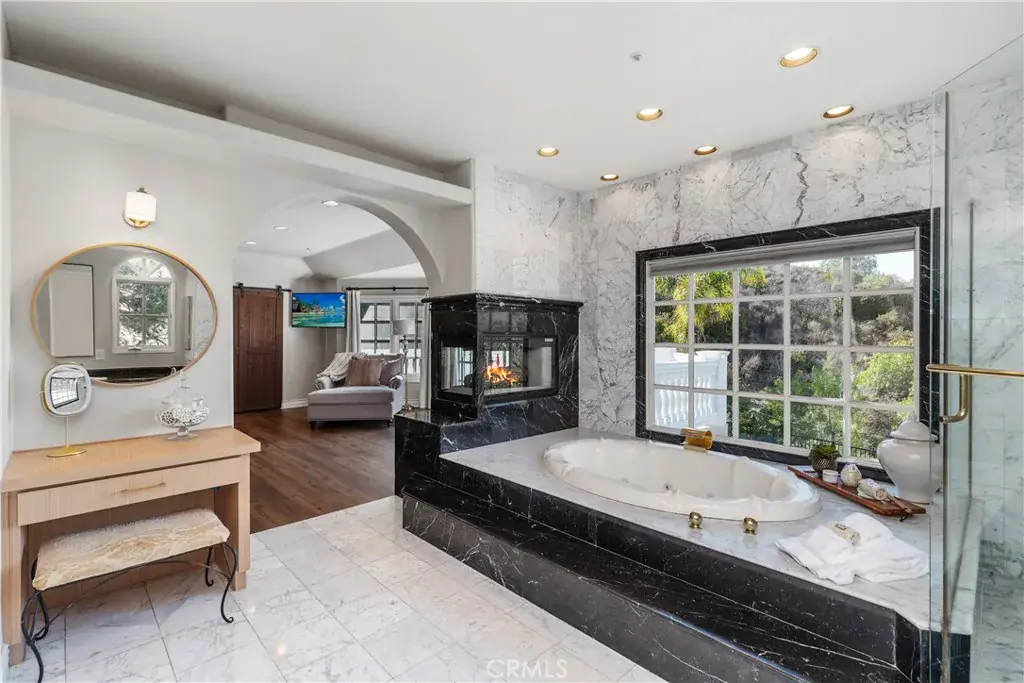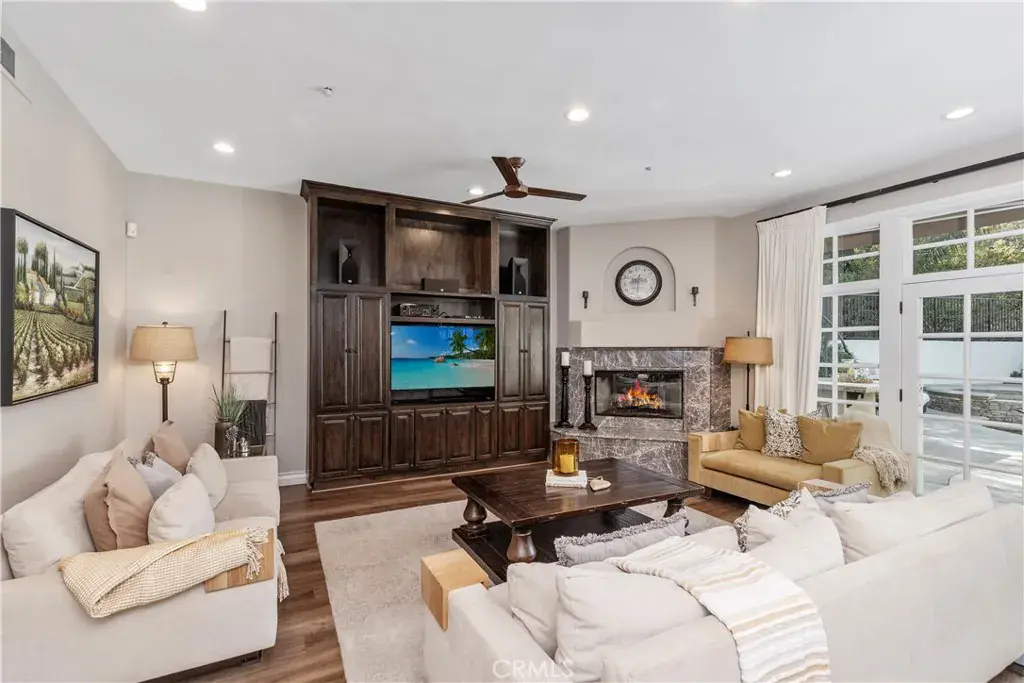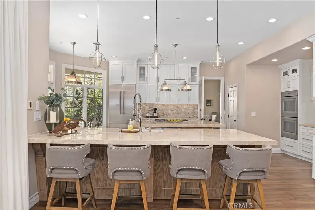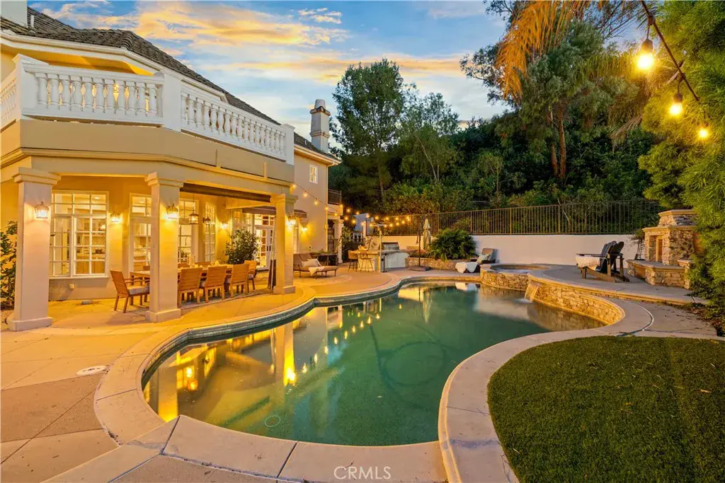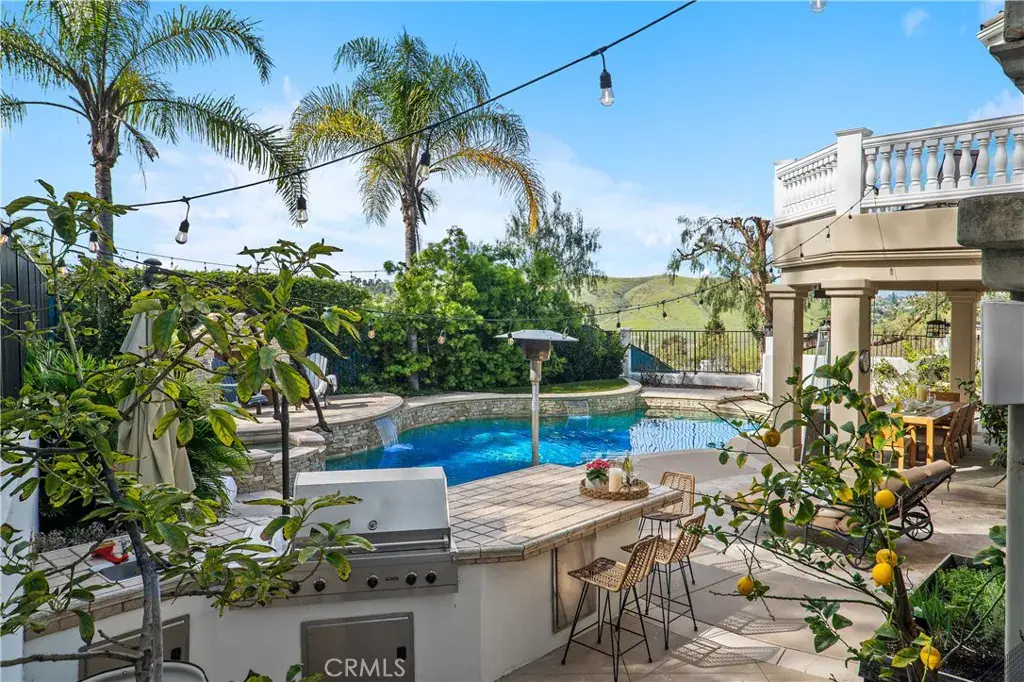 Impressive and secluded this Hunt Club secluded view home offers approximately 5,644 square feet of upgraded ‘livable’ living space with five bedrooms and four and a half bathrooms to include a bright custom downstairs office and spacious great room that wraps to a Newly Turfed side yard! With over an acre in property, this home offers privacy and an elegant timeless architectural design that includes an inviting entryway with impressive, coffered ceilings, dramatic staircase and an illuminating crystal chandelier. The long driveway provides ample parking for multiple cars while the backyard offers you an intimate and peaceful sunset setting! Enjoy a backyard boasting tranquil saltwater pool, spa, stone fireplace, and built-in BBQ surrounded by lush tropical landscaping and hillside views! The backyard also features a covered outdoor living area, perfect for ‘al fresco’ dining and entertaining guests. Inside, the home offers an abundance of natural light, complemented by charming architectural details. Professionally designed and gourmet inspired kitchen has been gorgeously remodeled in recent years with sophisticated soft tones, featuring Taj Mahal countertops, custom cabinetry, upgraded Thermador appliances and dual ovens, creating an exceptional cooking and entertaining space. Stone tile back splashes and accents adorn the kitchen with a large island, extensive counter area with wine refrigerator and drawer microwave. From kitchen to family room the flow is seamless and an inviting marble fireplace which creates a large setting for entertaining and family gatherings. Sunken living room- ONLY ONE STEP DOWN IN ENTIRE HOME- is a cozy retreat off entry and has a marble fireplace centered with coffered ceilings. Downstairs bedroom with an ensuite is perfect for in-laws or guests for added living flexibility! Primary bedroom is spacious with tall ceilings & a deck that captures sunsets and canyon views! The spa-like suite has Carrera white/black marble shower and tub plus newer cabinetry and black matte marble countertops. Three more en-suited bedrooms encompass the upstairs that also anchors a spacious great room & wet bar that has wraps around a side deck, large turf area to the backyard! The Hunt Club is a guard gated equestrian community that is close to downtown San Juan Capistrano with restaurants/shopping galore. Moments from Dana Pt Harbor & Doheny Bch. Blue Ribbon public schools and well-known private schools of St Margaret’s & JSerra are nearby.