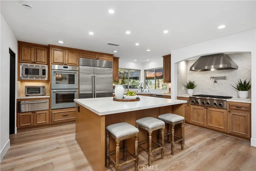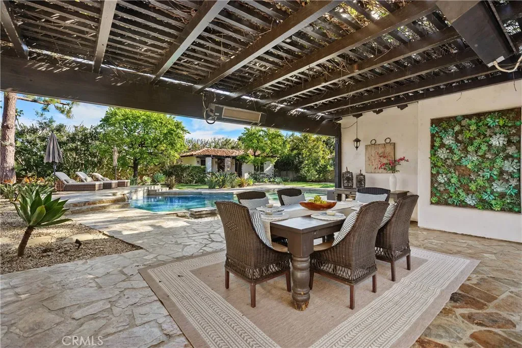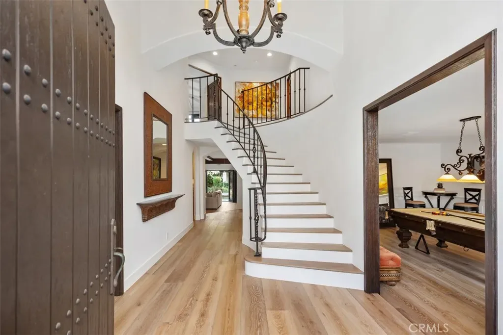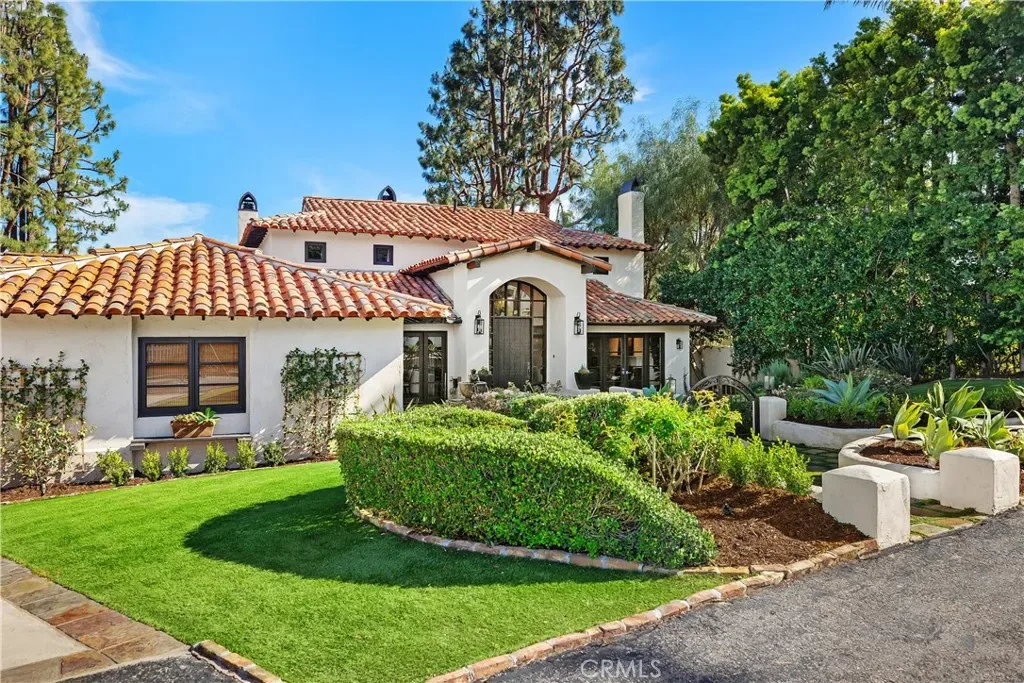 An exceptional private estate defined by timeless Spanish Colonial Revival architecture, bespoke design elements, expansive grounds, and resort-inspired living in one of San Juan Capistrano’s most desirable settings. Surrounded by approximately 22,000 square feet of beautifully curated grounds, the property blends classic design, impressive scale, and effortless indoor-outdoor living. A dramatic double-height foyer and sweeping curved staircase introduce interiors rich in character and craftsmanship. Vaulted and beamed ceilings, custom millwork, elegant lighting and brick accent walls create a warm yet refined atmosphere, while wide-plank wood flooring flows throughout the home’s main living areas. Now beautifully reimagined, the chef’s kitchen serves as the centerpiece of the residence. Anchored by striking Taj Mahal surfaces and an oversized island designed for gathering, the space offers generous storage, refined lighting, and an expanded pantry. Premium Thermador appliances including a six-burner range and dual dishwashers support both everyday living and entertaining. The kitchen flows seamlessly into the inviting family room with fireplace and French doors opening to the backyard. The thoughtfully designed floor plan offers exceptional flexibility with a spacious main-level suite featuring patio and fountain access. Also on the main level, a generous dual office suite provides versatility and could convert to an ensuite bedroom. Upstairs, the luxurious primary retreat features a sitting area with beverage refrigerator, fireplace, and private balcony capturing beautiful hill views. The spa-inspired bath includes a soaking tub, dual vanities, and walk-in closet. An additional spacious ensuite bedroom is also located on the upper level. Enhanced landscaping complements the estate’s architectural lines and mature setting. The expansive backyard is designed for relaxed living and gatherings, featuring a sparkling pool and spa, bocce ball court, shaded dining terrace with built-in BBQ, fireplace lounge, and fire pit. A detached two-room casita with patio and kitchenette offers flexibility for guests or extended stays. Equestrian zoning enhances the versatility of the property. Ideally positioned west of I-5 and just minutes from historic downtown San Juan Capistrano, the Los Rios District, coastal beaches, and Dana Point Harbor. A rare opportunity to enjoy timeless architecture, resort-caliber grounds, and an exceptional coastal lifestyle.