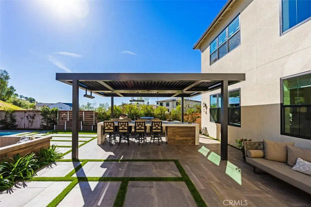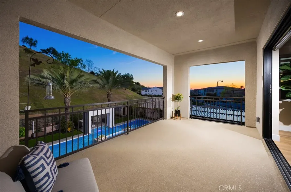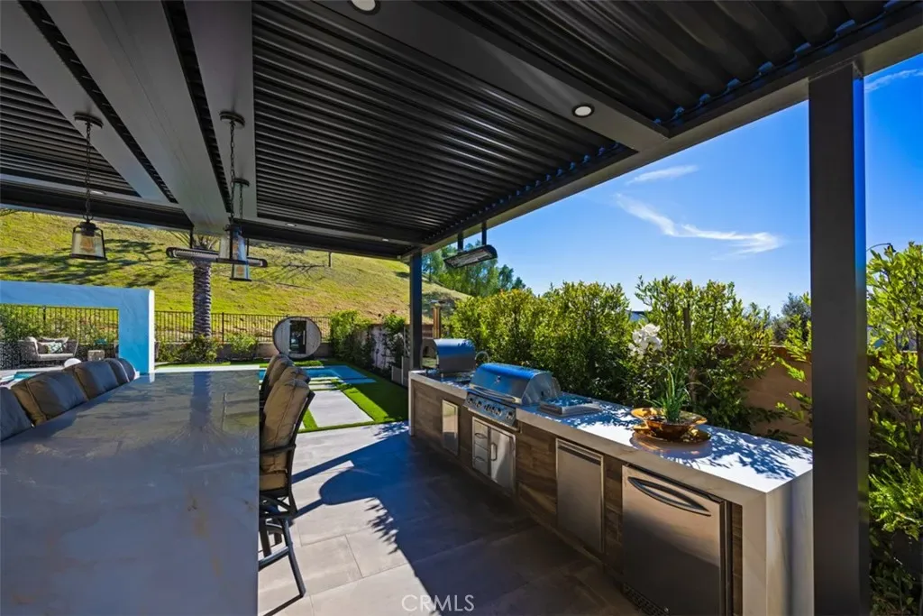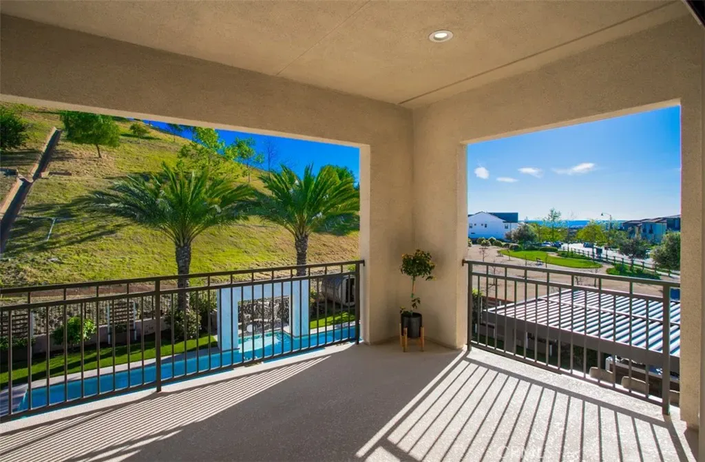 Ocean views, a resort-style backyard with pool, spa, sauna, cascading waterfall, fire table, and bar lounging areas create the ultimate setting for luxurious coastal living in Ocean Hills, just minutes from Dana Point Harbor. Ideally positioned with sprawling open space both behind and to the side, this beautifully refreshed residence offers exceptional privacy and a unique serene setting while enjoying access to Ocean Hills’ amenities which include an array of scenic trails along with a community clubhouse with water and entertainment amenities including a fitness center. Inside, the home has been thoughtfully updated with new flooring throughout, showcasing Calacatta Oro matte Italian porcelain tile across the entire main level. Fresh interior paint and a bright modern palette enhance the open-concept great room where expansive living and dining spaces center around views of the backyard oasis. The chef’s kitchen blends style and functionality with soft-close drawers/cabinets, a Sub-Zero refrigerator, JennAir six-burner gas range, under-cabinet lighting and a generous walk-in pantry. The main level offers exceptional flexibility with a private guest suite featuring an ensuite bath, along with a wellness room that can easily serve as a fifth bedroom, fitness studio or home office. Upstairs, a spacious loft landing provides additional living space while the primary suite offers a large private balcony with ocean and sunset views, an oversized walk-in closet and a spa-inspired bath with soaking tub, dual-entry glass shower, separate vanities, and a private balcony to take in the views and enjoy the coastal breeze. The backyard unfolds as a private resort-style retreat, designed for both relaxing and elevated entertaining. A saltwater pool and spa feature two Baja shelf entries and a dramatic waterfall cascading from a sculptural rain-wall arch. Tile blends seamlessly with turf and curated landscaping including fragrant roses, citrus trees and seven raised edible planter boxes. Outdoor entertaining has a fully equipped BBQ kitchen featuring a Fontana pizza oven, refrigerator, sink, and side burner. A spectacular 17-foot sit-up bar anchors the covered pergola with electric control shade, ceiling heaters and built-in lighting for year-round gatherings. Nearby is a gas fire-table lounge with integrated LED lighting. Additional highlights include a Pentair smart pool system, outdoor barrel sauna, epoxy garage flooring, and dual side yard gated access.