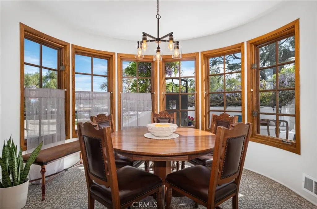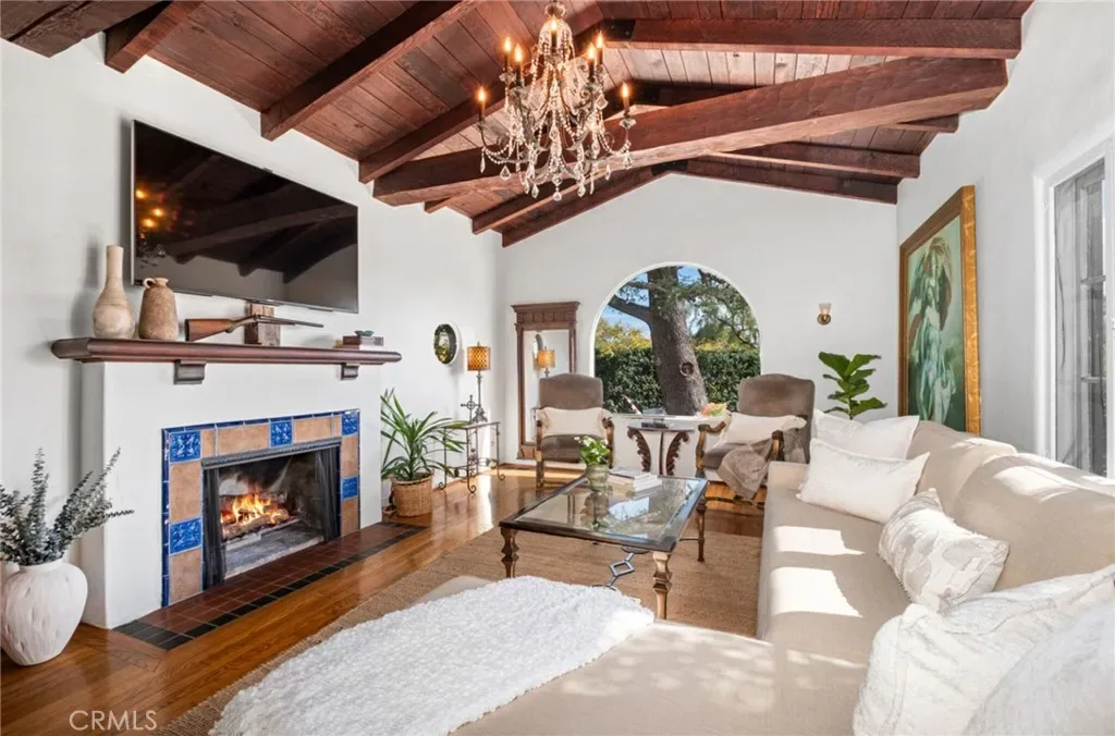 Architectural details reflect the timeless craftsmanship of another era: arched walls, open-beam ceilings, original lath and plaster, hardwood floors, and a classic clay tile roof. The home offers a formal dining room, a separate family room with walls of glass, and a layout designed for both elegant entertaining and everyday living.
