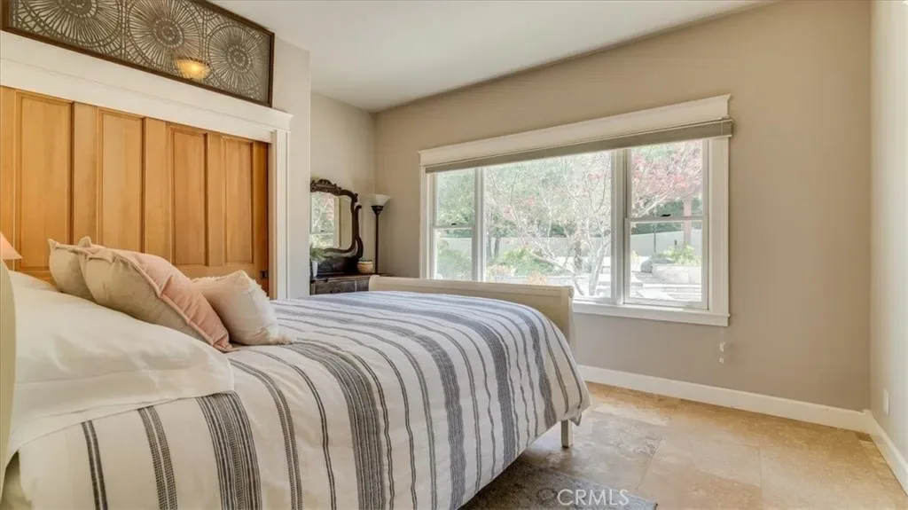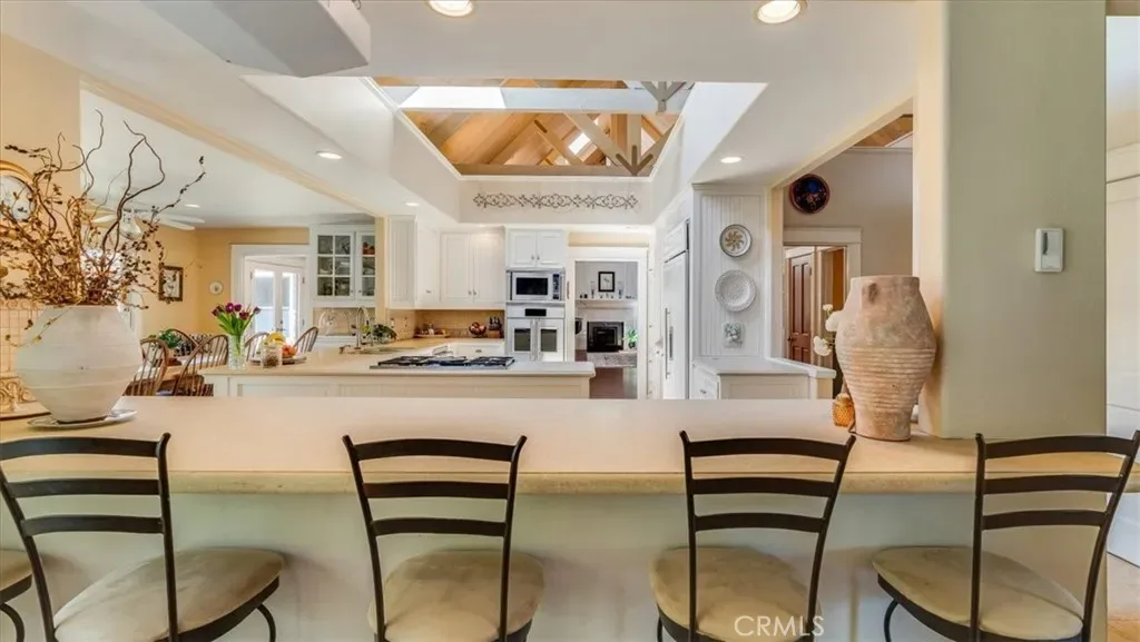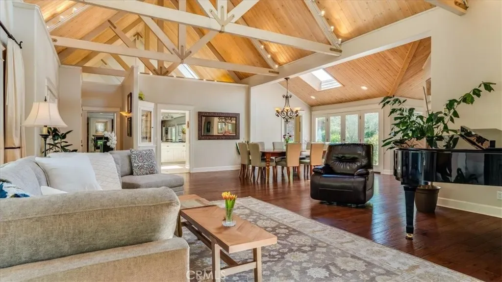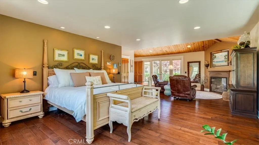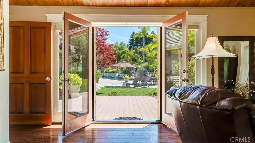 Hidden behind mature greenery and set well back from the road, this exceptional estate offers a rare blend of privacy, scale, and resort-inspired living in the coveted coastal enclave of Avila Beach. Encompassing approximately 7,000+ square feet of interior exterior living space – including decks and the workout room, the residence reflects a refined yet relaxed architectural style, thoughtfully designed for both everyday comfort and elevated entertaining. Sunlight pours through expansive windows and skylights, illuminating interiors that showcase soaring wood-beamed ceilings and rich hardwood floors. The home offers seven bedrooms and five bathrooms, including a convenient main-level suite and a private secondary living space complete with its own entrance, living area, and kitchen—ideal for guests, extended family, or flexible use. At the heart of the home, the kitchen combines warmth and function with quality appliances, generous prep space, and a natural gathering flow into the breakfast and family rooms. These spaces open directly to a covered, heated outdoor deck—perfect for year-round dining and effortless access to the pool and grounds. The primary suite serves as a peaceful retreat, featuring its own fireplace, built-in seating, and serene garden views. A spa-like bathroom includes a soaking tub positioned to overlook the landscape, a large walk-in shower, and thoughtful design elements that elevate daily living.