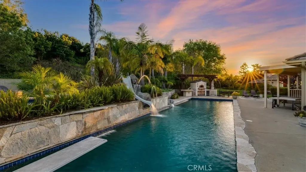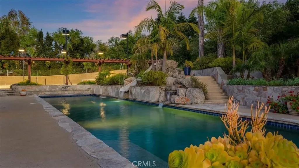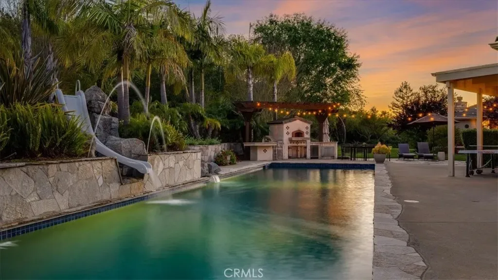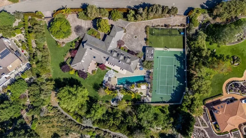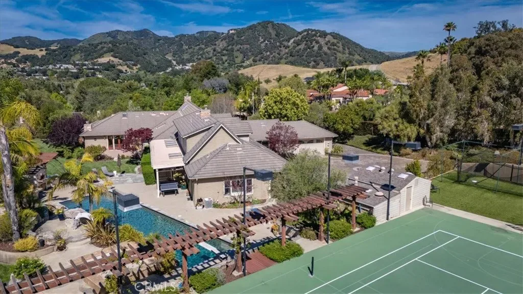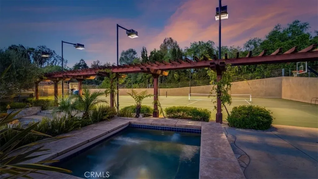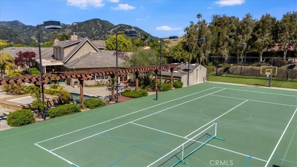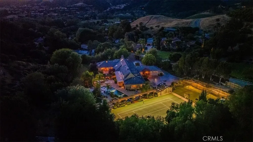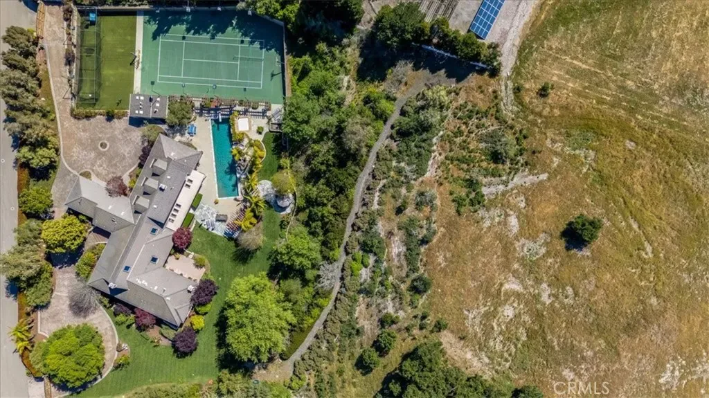Outside, the property transforms into a private resort. A large pool and spa with cascading water features create a relaxing centerpiece, while stone pathways wind through beautifully landscaped gardens filled with intimate seating areas. Recreational amenities abound, including a full-size tennis court currently adapted for pickleball, a separate sports court, and a basketball area. Sitting behind the improved backyard is a large grassy knoll up the hill with spectacular views, primed for a multitude of options. An expansive outdoor entertaining space is equipped with a built-in kitchen, BBQ, pizza oven, and warming features—ideal for hosting gatherings in a truly unforgettable setting. Additional features include multizone radiant floor heating, high end HVAC system, multiple water heaters, a whole house water filtration system, surround sound speakers, a large movie projector with screen, dual electric meters, and a commercial-grade gas line—ensuring both comfort and efficiency.