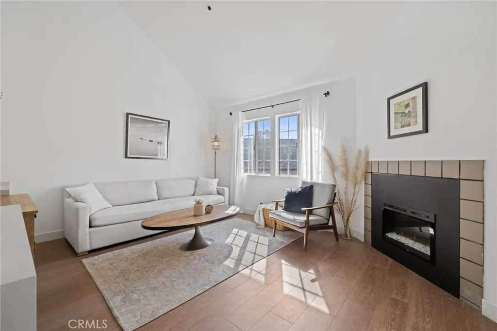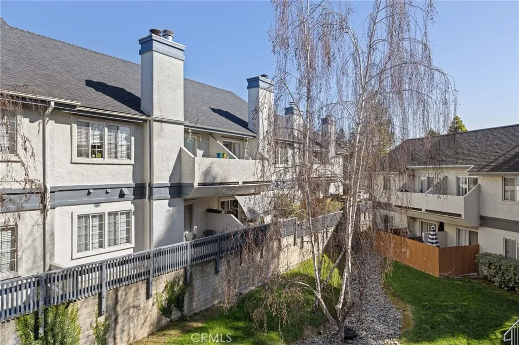 Soaring ceilings and high windows fill the home with natural light, while a private balcony overlooks the courtyard trees, creating a peaceful retreat.