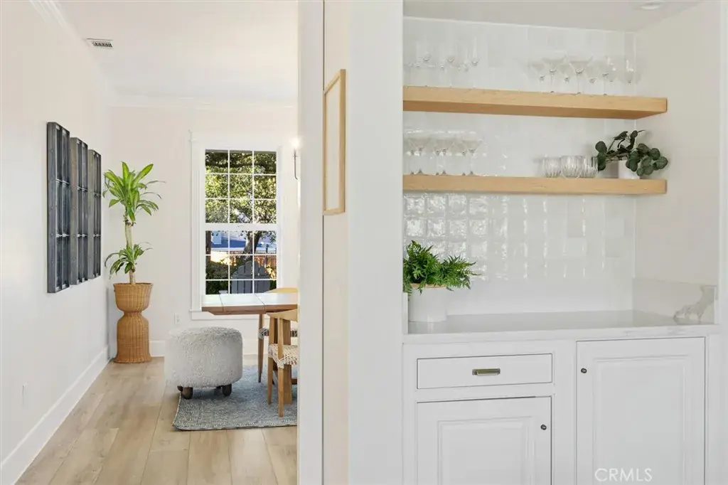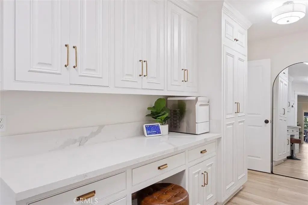 Inside, an open layout connects the kitchen, living room, and built-in bar, making it ideal for everyday living and easy entertaining. The remodeled kitchen features quartz countertops, new stainless appliances (double ovens and a 6-burner cooktop), a decorative tile backsplash, breakfast nook, walk-in pantry, generous bar seating, and a center-island prep sink. Just off the kitchen, the family room offers expansive tongue-and-groove ceilings, a cozy fireplace, and French doors to the backyard with its putting green, outdoor kitchen, and well-appointed dining area. To the left of the foyer are a formal sitting room, half bath, and built-in office.