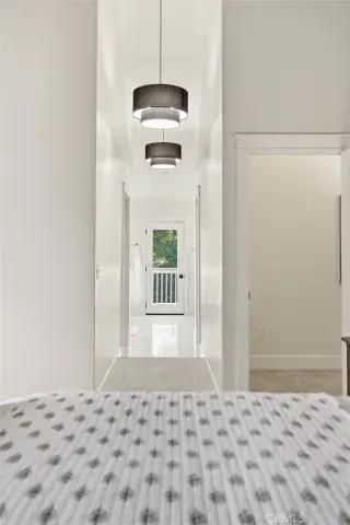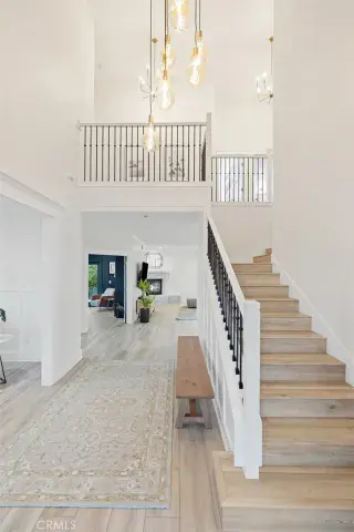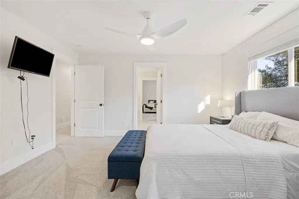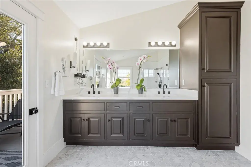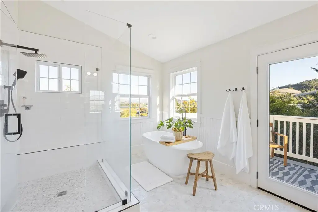 The serene primary suite features vaulted ceilings, a modern fireplace, two balconies, and a walk-in closet. Its spa-style bath includes a soaking tub, separate shower, dual sinks, ample storage, a private water closet, and marble floors.