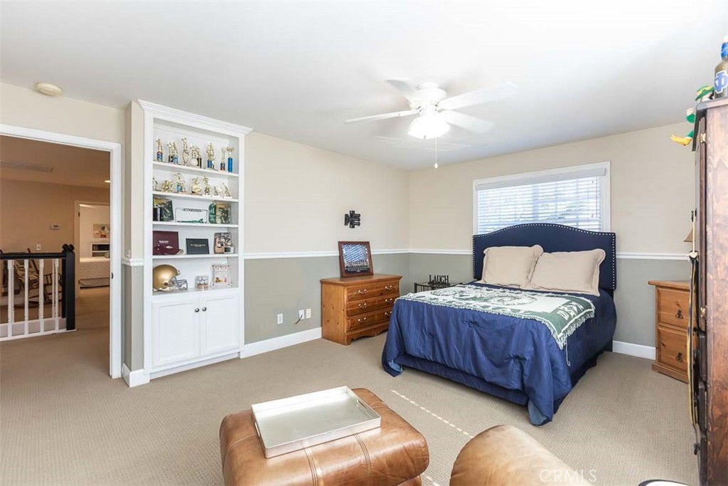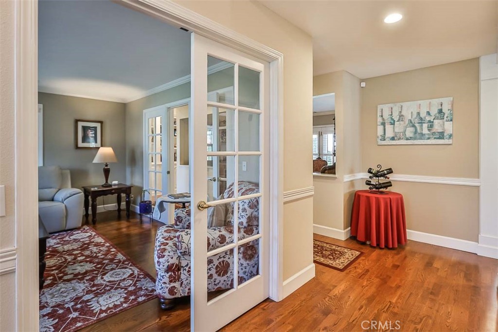 The thoughtfully designed downstairs primary wing provides exceptional flexibility, featuring an office, separate entry, and private front and back patios with French doors—perfect for single-level living, guest accommodations, in-law quarters, or a caretaker suite. At the heart of the home, a spacious and inviting family room boasts vaulted ceilings, a fireplace, built-in desk, and a casual dining area that flows seamlessly into the light and bright kitchen. Here, coffered ceilings, a marble backsplash, butcher block island, and walk-in pantry create a space that is as functional as it is beautiful.