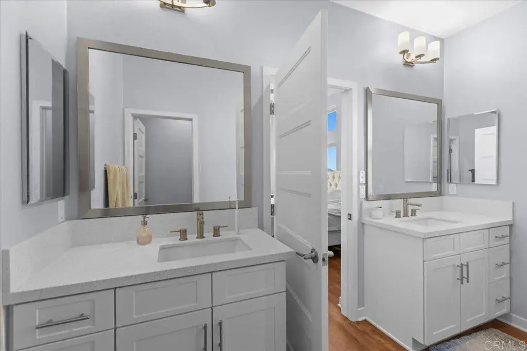 Newly built modern San Elijo Townhome in a Prime Location! Experience the best of coastal living in this immaculate, light-filled townhome nestled in the heart of San Elijo Hills. Enjoy the ultimate in convenience—just steps from local dining, shopping, parks, top-rated schools, scenic walking trails, and everyday amenities. Charming entry patio welcomes you into this beautifully designed three-level home, featuring high ceilings, abundant natural light, and modern, high-end finishes throughout. The entry-level bedroom with a full bath offers flexibility for use as a guest suite, office, or home gym. Upstairs, the open-concept living area is ideal for entertaining, with the living room, kitchen, and dining space opening to a balcony where you can enjoy mountain views and gorgeous sunsets. The kitchen is a true showpiece—highlighted by quartz countertops, designer tile backsplash, pendant lighting, premier stainless steel appliances, a walk-in pantry, and soft-close cabinetry with pull-out drawers. The third floor showcases a spacious primary suite with stunning mountain views, dual sinks with quartz counters, a walk-in shower, and a generous walk-in closet. A secondary bedroom, full bath, and laundry room (washer and dryer included) complete this level. Designer upgrades include luxury vinyl plank flooring throughout, top-down/bottom-up blackout window coverings, and sound-reducing dual-pane windows. Additional highlights include a tankless water heater with on-demand hot water recirculation, central AC, ceiling fans throughout, a built-in Murphy bed, an attached two-car garage with extra storage space and pre-wired for an EV charger, Smart Home technology, and a built-in Murphy bed. Built in 2019, this unique residence is one of only twelve homes in the community—offering the perfect blend of modern comfort, a walkable lifestyle, and the peaceful charm of San Elijo Hills. THE SAN ELIJO HILLS NEIGHBORHOOD: Enjoy the shops and eateries along with the 18 miles of trails & 19 acre park, 1000 acres of open space. Community includes high ranking schools (desirable Double Peak K-8), ballparks, soccer field, picnic & bbq area, playgrounds, dog park, community center…and all are within a short distance. Enjoy the Southern California Coastal lifestyle, a short drive to the beaches and everything San Diego County has to offer. Dimensions & sq footage are approximate, per builder & assessor’s record. Mello-roos is estimated. All MLS and marketing info is approximate and not guaranteed.