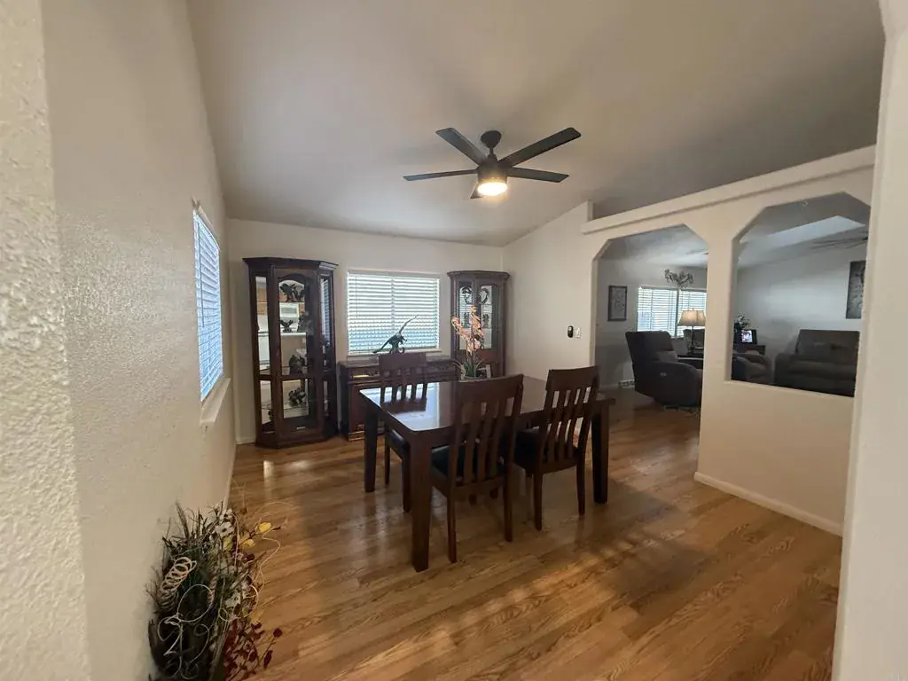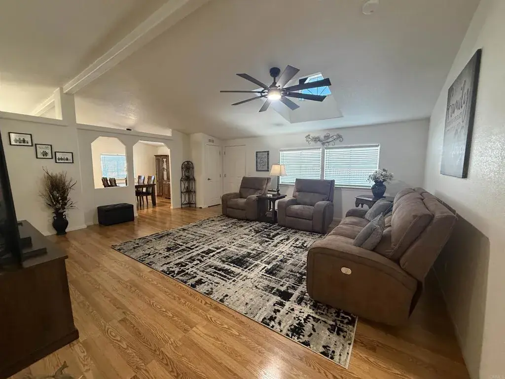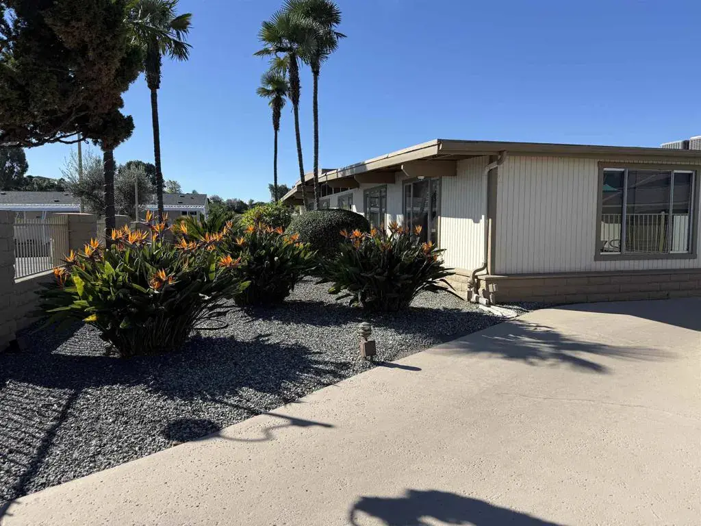 This move-in-ready home is now available in the sought-after 55+ Madrid Manor community. Notably, this property includes the land, so there is no land lease or rent required. The home features vaulted ceilings with skylights for natural light, laminate flooring, and ceiling fans in every room. The layout includes a wide hallway leading to the bedrooms and a guest bath, plus an optional room perfect for a den, office, or craft space. The large kitchen offers a center island for extra workspace, while the primary suite includes a walk-in closet and a walk-in shower. Outside, an extra-long carport provides ample space for outdoor entertaining. The unit is conveniently located near the clubhouse and guest parking, with easy access to I-15 and shopping. Madrid Manor amenities include: Large clubhouse with a kitchen and dining area (125-person capacity) Pool, spa, and fitness facilities (exercise and aerobics rooms) Card room, library, and pool room with three tables Tennis and pickleball courts, mini-golf, and shuffleboard Dance studio and additional meeting rooms Landscaped hillside with walking paths