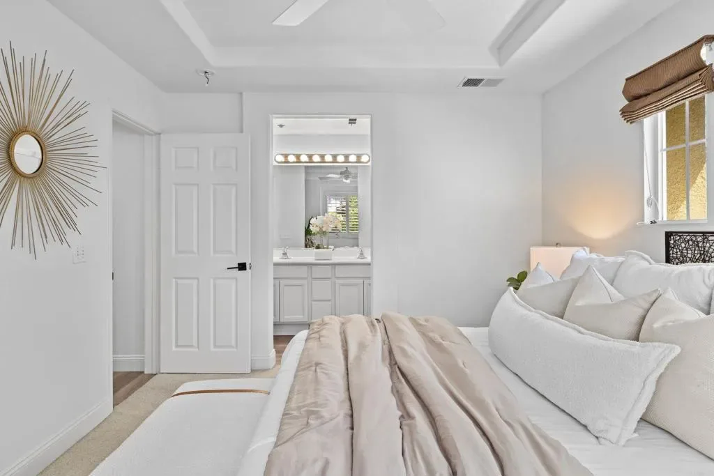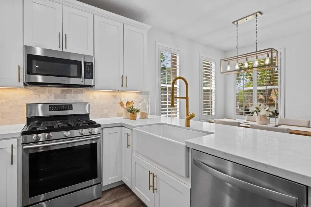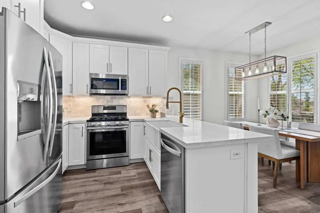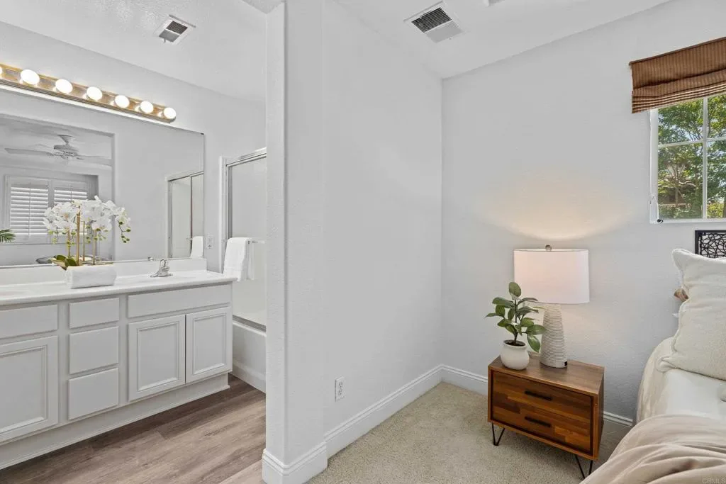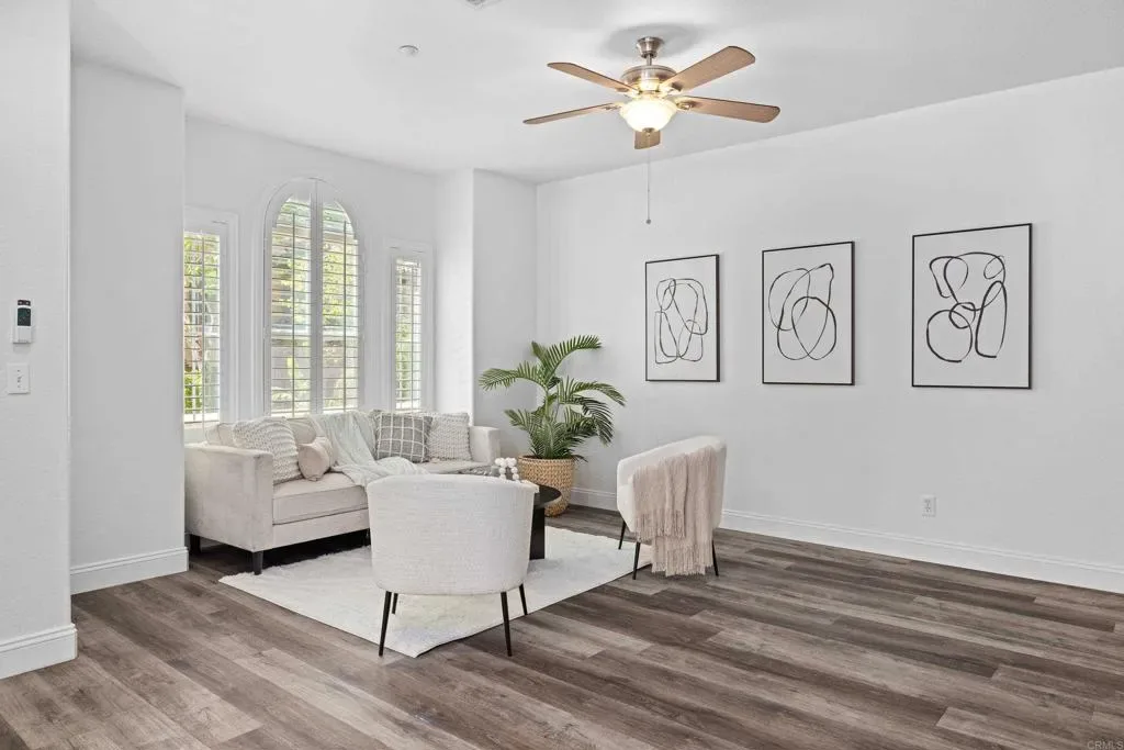Welcome to this beautifully upgraded corner unit townhouse in the highly desirable San Elijo Hills neighborhood of Morgans Corner. Ideally situated as an end unit, this home offers abundant natural light and an elevated entry with picturesque mountain views. Enjoy indoor-outdoor living with a charming front patio, the perfect spot for morning coffee or an evening wind down. Inside, the home feels light and bright with fresh interior paint, recessed lighting, ceiling fans, and luxury vinyl plank flooring that flows seamlessly throughout the main living areas. The modern kitchen is designed to impress, featuring elegant quartz countertops, ample cabinetry, and a spacious pantry for optimal storage. Whether you’re entertaining or enjoying a quiet evening at home next to the cozy electric fireplace, the open layout creates a welcoming and functional space. Residents of this sought-after community enjoy access to resort-style amenities, including a sparkling pool and relaxing spa, perfect for soaking up the Southern California sunshine. This exceptional Morgans Corner townhouse combines comfort, style, and location all in one of North County’s most desirable neighborhoods. Morgans Corner neighborhood in San Elijo Hills, community includes high ranking schools (Middle & Elementary), ballparks, soccer field, picnic tables, bbq, playgrounds, dog park and community center, and all are within walking distance. Enjoy the shops and eateries along with the nearly completed 18 miles of trails & 19 acre park and 1000 acres of open space. Seller to select services. Room dimensions & sq footage are approximate, per builder & assessor`s record. Mello roos is estimated. All MLS & marketing info is approximate & not guaranteed. Buyer to verify all info to satisfy self with the property.