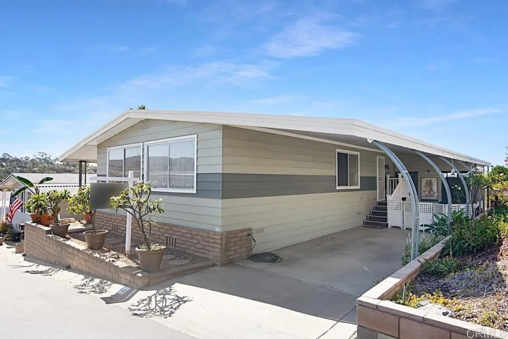 DO NOT look any further, I repeat, DO NOT look any further UNLESS you like ocean views and beautiful sunsets. Arguably, one of the top 20 lots in the swanky 55+Community of Palomar Estates West, this two bedroom / two bath home is ready to be yours! Besides the views, this home also comes with a RARE large backyard. Approximately, 45’x25’, it is beautifully landscaped with plenty of space for entertaining, gardening, or just relaxing and enjoying the wonderful ocean breezes. Some other details I love about this home: The roof and exterior paint is less than 4 years old. There is an extra large storage room at the end of the carport that is perfect for that needed workshop, craft or exercise space, or just storage–I LOVE storage!! In addition, there is a separate garden shed for your tools, pots and potting soil! The “California” room, which you can access from the exterior or 2nd bedroom, adds an additional 130+sqft! Another overlooked detail is that the curved awning poles give you more space for parking and guest parking is conveniently located across the street. Palomar Estates West is a 5 star 55+/35+ senior rent controlled park. Yes, the space rent is capped here! There are many activities and amenities including a beautiful clubhouse, pool, spa, sauna, gym, billiards, putting green, dog park, ping pong, and tennis courts. Did you say pickleball? Someone said pickleball and yes, there are 4 beautiful courts. This community offers you the opportunity to be as active or as social as you wanna be. Monthly breakfasts, themed parties, craft fairs, meditation classes, pickleball club, and more! Gated RV parking offered if needed. This home is located minutes to Lake San Marcos dining and golf as well as local Carlsbad beaches, shopping, and restaurants. The question is not why would you live here, it’s why wouldn’t you?!