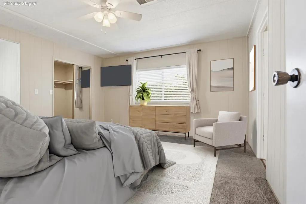 If you like square feet, we have 1,761 of it! Representing one of the larger models in Palomar Estates West, this 3 section home has a beautifully remodeled Kitchen w/ large island, pantry, new garbage disposal, self-cleaning oven, under counter lazy Susan, roll out spice rack, roll out double trash, & recessed lighting. Not stopping in the kitchen with the upgrades, there is even a built-in dining nook with a beautiful table and bench seating. The Main Bedroom has a giant walk-in closet and big upgraded bathroom with dual sinks. Additionally, off the main bedroom is an office / retreat which makes a great reading room, hobby room, exercise room, you name it! Along with brand new carpeting is a newer roof, newer A/C & furnace, newer exterior paint, updated Bathrooms, dual pane windows, custom blinds, ceiling fans & more. Personally, I love the oversized laundry room with utility sink, desk, & tons of extra storage space. Outside offers a ramp for easy access, a brick open air patio, a covered porch, a garden bed, 3 fruit trees, and a storage shed. This is a 35/55 resort style community that is rent controlled. Age 55+, 2nd resident can be 35+. The monthly space rent is only $720 per month. This home is also a Post HUD & on registration (NO property taxes). When I say “Resort Style” – let me elaborate. Pool, spa, sauna, BBQ, billiards room, community center, dog park–should I go on? Okay, tennis court, pickleball courts, workout room, lawn bowling, putting green–should I stop now? No? Breakfast first Saturday of the month, pickleball club, meditation class, water aerobics, knitting group, monthly community dances, movie nights, book club, social committee, craft fairs, car wash and more!!! Got an RV? There’s parking for that too! You want to know more? Come see me at one of our open houses or give me a call!