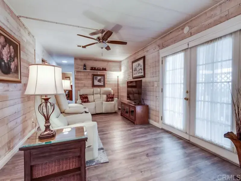 Beautifully updated home in highly desired Palomar Estates West. The open floor plan and vaulted ceiling in the living room make this home feel very spacious. The stunning kitchen has been remodeled with white shaker cabinets and natural stone countertops. The primary bedroom has an on-suite bathroom with a gorgeous tiled shower. The second bedroom has a large sitting area that can be used as an office. The home has dual pane vinyl windows throughout that will keep the home very comfortable in the wonderful San Marcos weather. Plank vinyl flooring is located throughout the main living areas. From the back porch you can enjoy beautiful sunrises and views of the surrounding hills. There is a large shed to store your extra items and lots of guest parking right next to the house for your guests. The home is on registration which means NO PROPERTY TAX. Palomar Estates West is a 5 star 55+/35+ senior rent controlled park with many activities and amenities including a beautiful clubhouse, pool, spa, gym, putting green, pickleball courts, and tennis courts. This home is located minutes to Lake San Marcos dining and golf as well as local Carlsbad beaches, shopping, and restaurants.