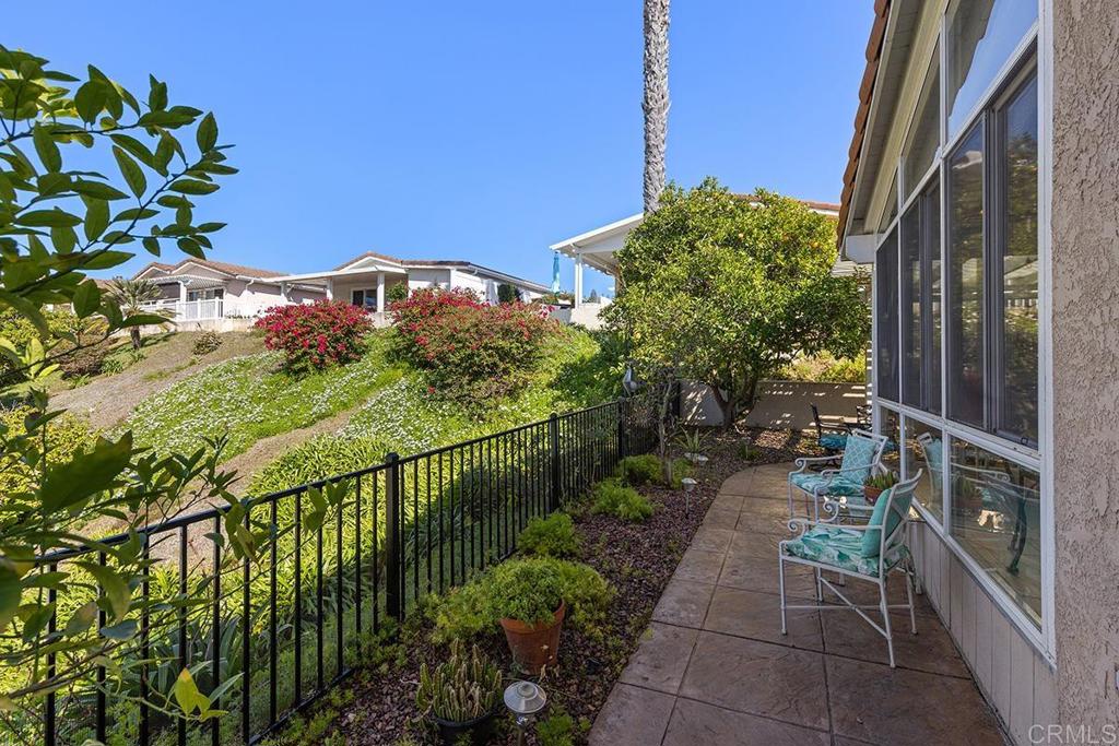 This remarkably beautiful home is located in the desirable Las Brisas Pacificas, a gated community exclusively for residents aged 55 and over. Situated just 7 miles from the beach, this home offers both convenience and an exceptional quality of life. Land owned home and low HOA make this community an exceptional value. The residence has been completely updated to provide modern comfort and style. The remodeled kitchen and primary bathroom are designed with contemporary finishes, while the hand-scraped wide plank laminate flooring and tile flooring throughout the home add a touch of elegance. The designer color palette creates a welcoming and sophisticated atmosphere. Ship-lapped walls add a custom feel to the home. A sunroom addition, enclosed entirely with windows, offers an extra square footage of living space, perfect for relaxation or entertaining guests. Dual pane windows with plantation shutters enhance both energy efficiency and aesthetic appeal, and three solar tubes provide abundant natural light throughout the interior. The home includes an oversized two-car garage and an indoor laundry area. A garden patio, enhanced by two aluminum patio covers, stamped colored concrete and fragrant plantings, provides a comfortable outdoor space with lovely views and privacy. The home is equipped with HVAC that is only five years old, ensuring reliable comfort year-round. Every detail has been thoughtfully considered to make this property a truly special place to call home.