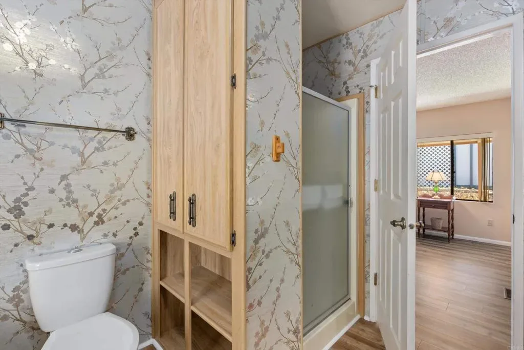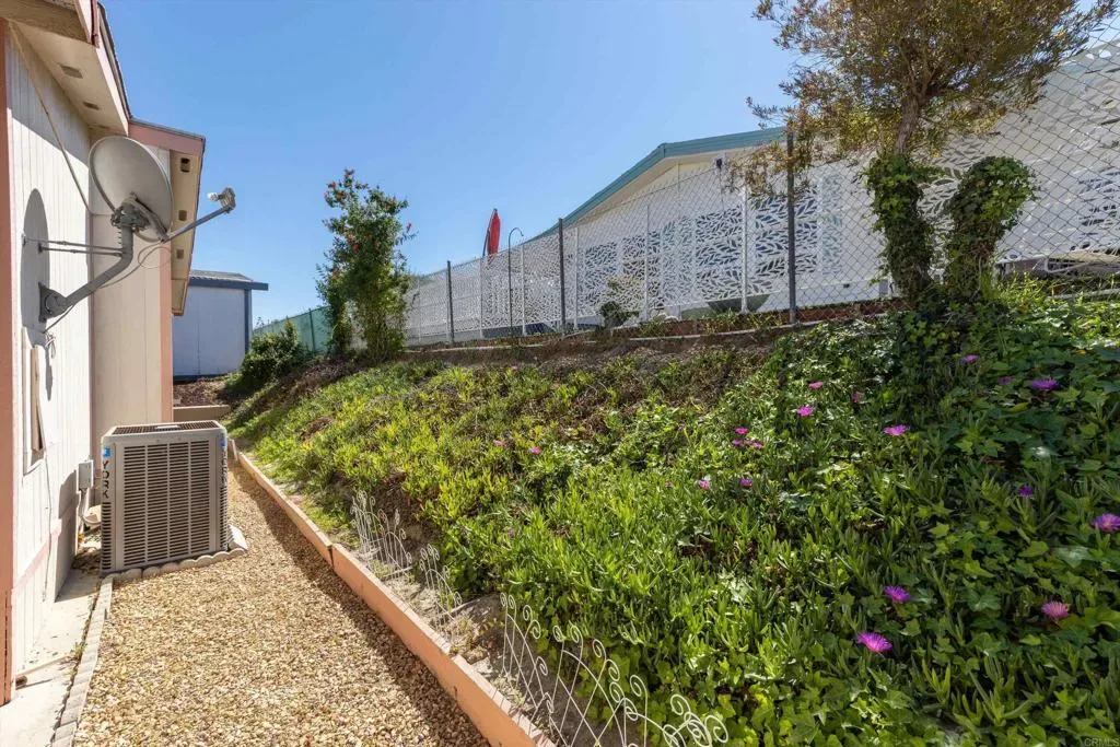 Welcome to resort-style living in the highly desirable 55+ community of Rancho Vallecitos—offering city rent control and an exceptional lifestyle filled with amenities and social opportunities. This inviting home features vaulted ceilings, a drywall interior, and durable hard-surface flooring throughout, creating a bright and low-maintenance living environment. The spacious kitchen is equipped with stainless steel appliances, abundant cabinetry, and generous pantry storage. An oversized laundry room with built-in desk and cabinetry provides the ideal flex space for a home office, hobby area, or additional storage. Built-ins throughout the home ensure everything has its place. The primary suite offers a comfortable retreat with a walk-in closet and an ensuite bathroom featuring both a separate soaking tub and walk-in shower. A spacious guest bedroom adds flexibility for visitors or additional workspace. Step outside to enjoy a private covered patio set behind the front porch, along with a low-maintenance turf yard—perfect for relaxing or entertaining. A large storage shed adds even more convenience. Residents of Rancho Vallecitos enjoy access to a beautifully maintained, 5-star community featuring a clubhouse, pool and spa, fitness center, library, billiards room, game and craft spaces, putting green, dog park, and optional RV parking. With a current monthly space rent of $706.32 and the benefit of city rent control, this home offers both comfort and long-term value.