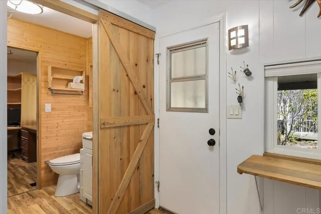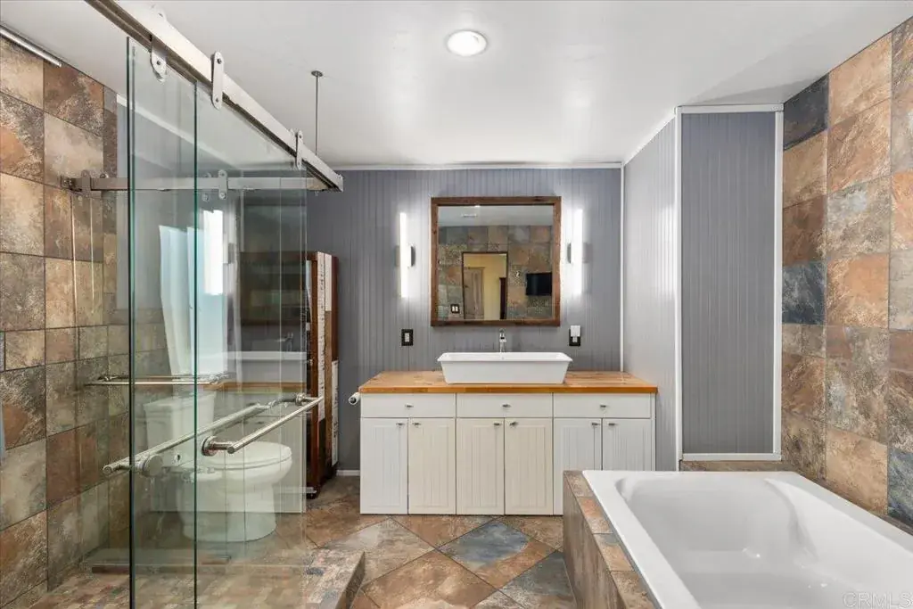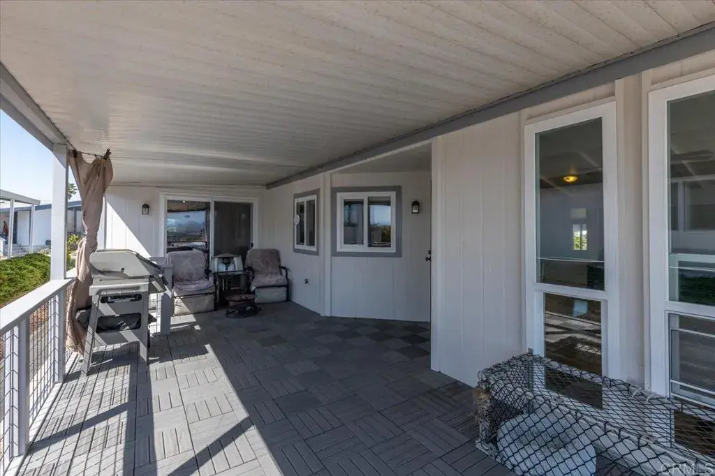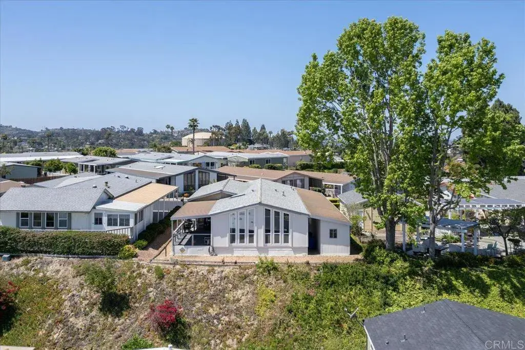 Beautifully remodeled 3 section home that sits high on top of a cul-de-sac street within in Rancho Vallecitos; a resort style 55+ community that is very social & active and has rent control! VIEWS from every direction; Sunrises, city lights, mountains, and winter snow caps can be enjoyed from your deck and Living room windows, while sunsets and a peekaboo ocean view can be enjoyed from the Primary Bedroom! The shed has been improved to be the max legal size and features an automatic garage door and can fit a motorcycle. The home has many other special upgrades including dual pane windows, refinished ceilings, custom interior doors and finishes, a newer 40 gallow water heater, updated Kitchen and Bathrooms, butcher block counters, wet bar, LED lights, and more! There is a spacious Living room with vaulted ceilings and high windows, as well as an additional Family room / Den and wet bar. The Primary Bedroom features a huge walk in closet and ensuite Bathroom with large custom shower and tub. The Guest Bedrooms has been converted to an office and also has it’s own ensuite Bathroom. The Utility Room is larger than most with extra space to double as an office work space. Convenient to guest parking. Monthly space rent is $740 per month and is under city rent control. 1 dog, or 1 dog & 1 cat, or 2 cats okay if < 20 lbs / no dog walking or permanent pet fencing allowed in park. There is a large dog park within this community just down the street from this home that you are allowed to walk your dog to. Age 55+ (2nd resident can be 45+), must be owner occupied.
