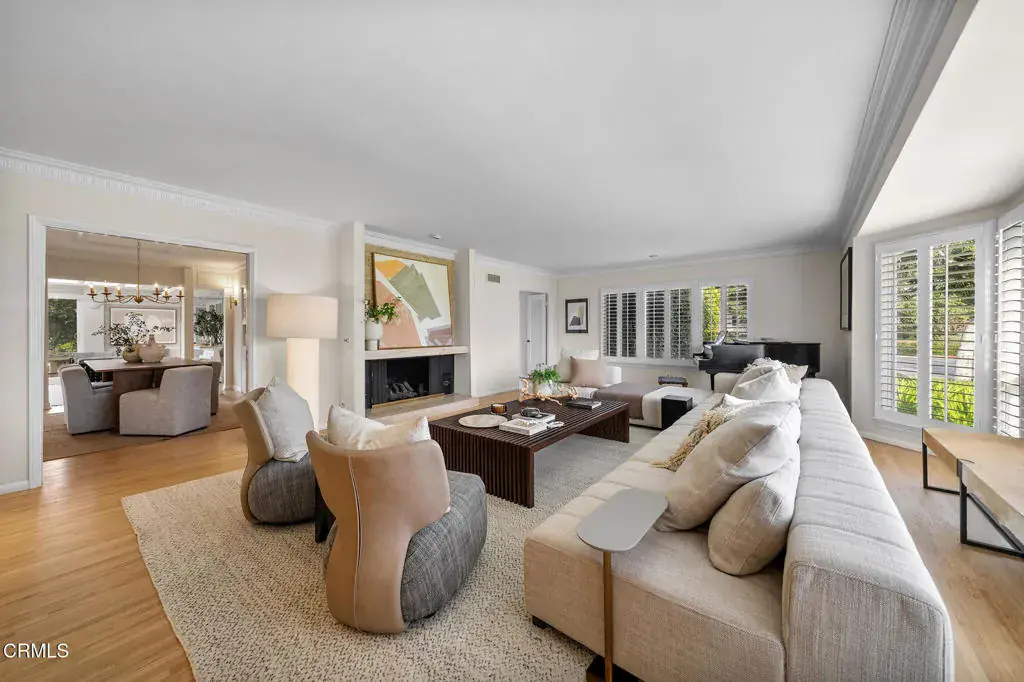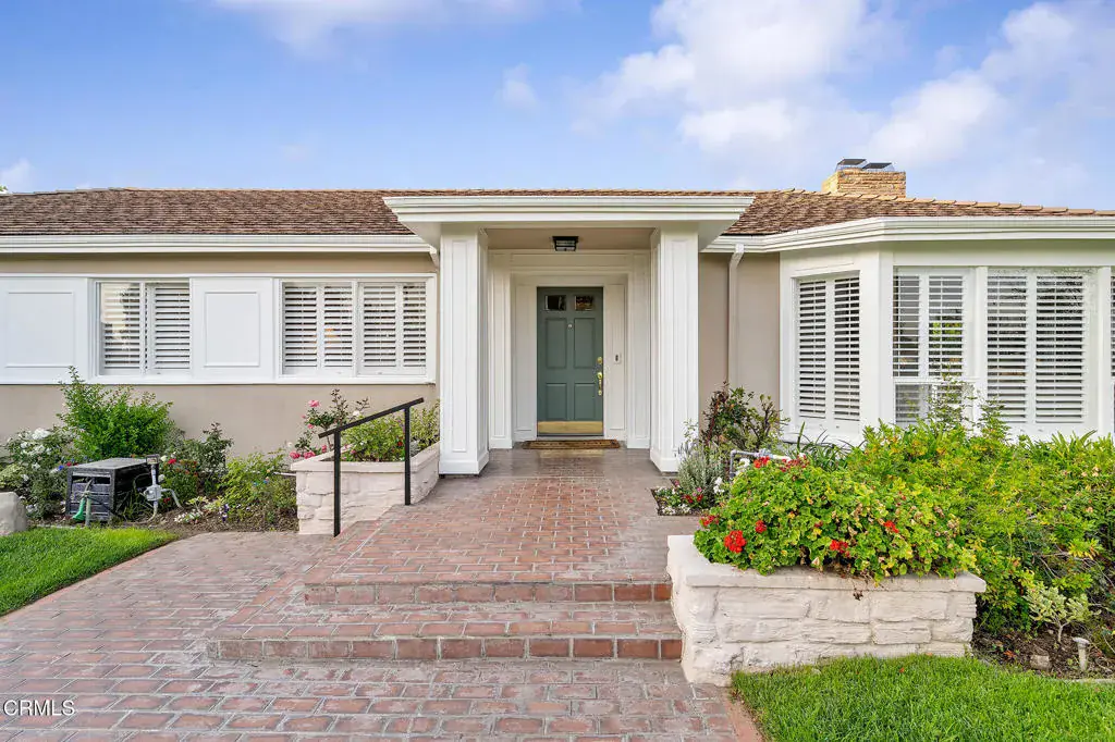 Offered for the first time in 60 years, this sprawling property is situated on a corner lot on a wide residential street. A sweeping front lawn with tiered brick steps leads to a welcoming front porch. The generous entry hall features newly refinished wood flooring throughout establishing a refined & cohesive aesthetic. To the right, the stately living room is filled with natural light from expansive bay windows with plantation shutters overlooking the front yard. A handsome stone fireplace anchor the space, making it well suited for both formal entertaining & everyday living. Double doors open to a library/office with built-in shelving & cabinetry, highlighted by two vintage illuminated stained-glass panels, a fireplace & a sliding door that leads to the side yard. Adjacent to the library is a step-down bedroom with double closets & two walls of picturesque windows of the garden. Adjoining the bedroom, a sunroom filled with natural light from skylights & large sliding doors on 2 sides. Complete with a fireplace & wet bar, this space offers a comfortable setting for casual dining or relaxed conversation while enjoying views of the backyard. Connecting the sunroom & the grand living room is the formal dining area, accented by a sleek chandelier and complementary wall sconces. Nearby, the efficient kitchen is designed with abundant cabinetry & overlooks the rear covered outdoor area. A pass-through window above the sink provides convenient access for serving food & beverages to the covered patio. The adjacent laundry/mudroom includes a utility sink, storage closets, & direct access to the covered patio. Off the long hallway, sunlit with skylights, is the second bedroom with built-in shelving, along with a hallway bath featuring double sinks & a shower-over-tub. This bath connects to an additional wing with a large Jacuzzi tub & sliding door access to the patio. The primary suite offers two bathrooms: one three-quarter bath with mirrored closets & a second full bath with a walk-in closet. The fourth bedroom features a built-in desk & a spacious closet with mirrored doors, as well as a sliding glass door to the back porch with easy access to the driveway. Completing this expansive property are a potting and storage shed, a three-car garage with an attached workshop, & a backyard accented by a small pond, flowering plants, & citrus trees. This well-loved home presents a wonderful opportunity for its next owner to personalize & enjoy for many years to come!!!