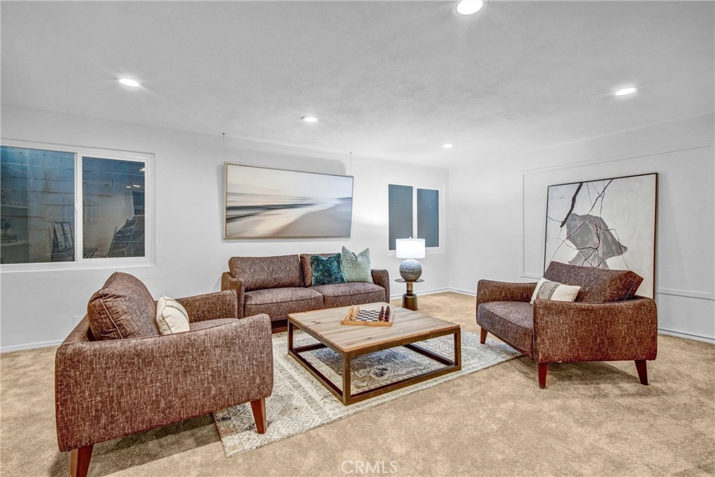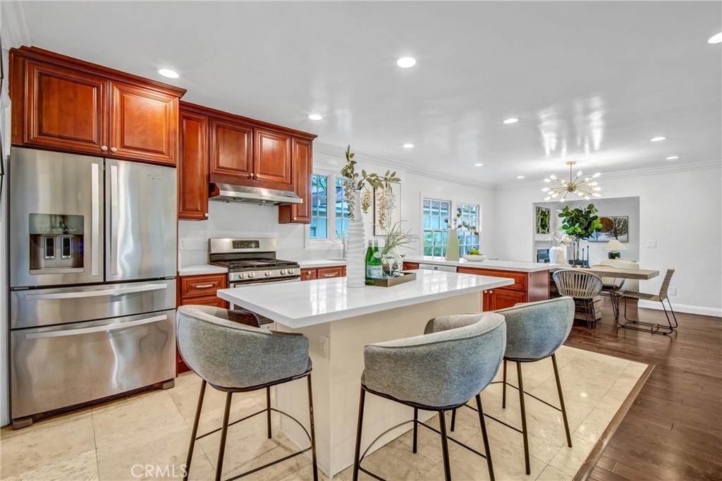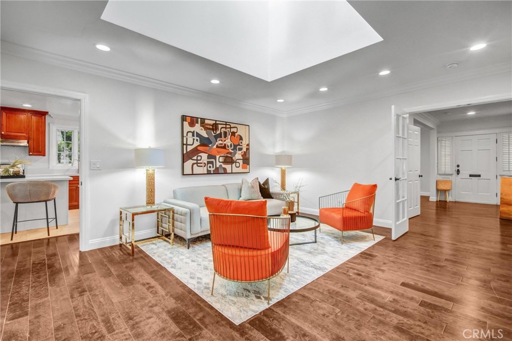 The inviting living room is centered around a classic fireplace, creating a warm and comfortable setting for everyday living and entertaining. The family room is highlighted by a rare convertible skylight, allowing abundant natural light and the option for open-air enjoyment—ideal for Southern California living.