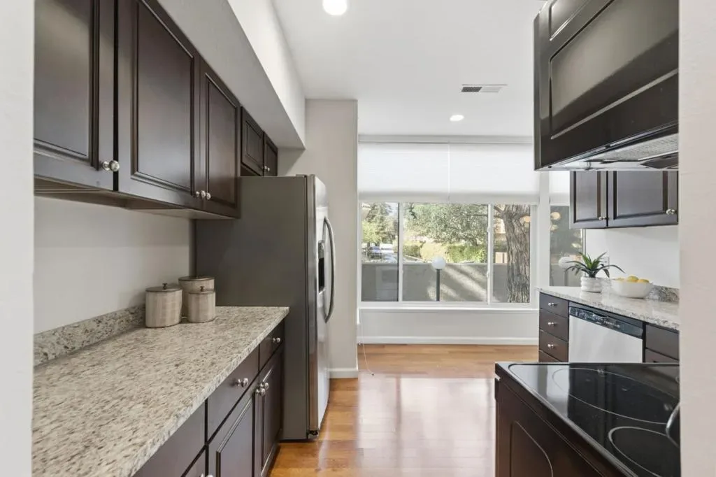 Situated in the heart of San Mateo, 11 Hayward Ave #1009 offers the perfect balance of comfort, convenience, and style. The inviting living room features a cozy wood-burning fireplace and walls of glass that open to your own enclosed patio ideal for morning coffee or a private garden retreat. The open dining area flows seamlessly into a well-appointed kitchen with dark wood cabinetry, granite countertops, modern appliances, and generous storage. The spacious primary suite offers a double-sink granite vanity, stall shower, and soaking tub designed for relaxation. A versatile second bedroom is perfect for guests, a home office, or fitness space, complemented by an updated full hall bath. Additional highlights include a dedicated laundry closet with full-size machines, extra storage, new carpet in the living areas, and rich wood flooring at the entry. The community features a resort-style pool, spa, and expansive sundeck. Just minutes from Central Park, vibrant downtown shops and dining, and Caltrain, with easy access to major commute routes, this home delivers comfort and connection in one exceptional location