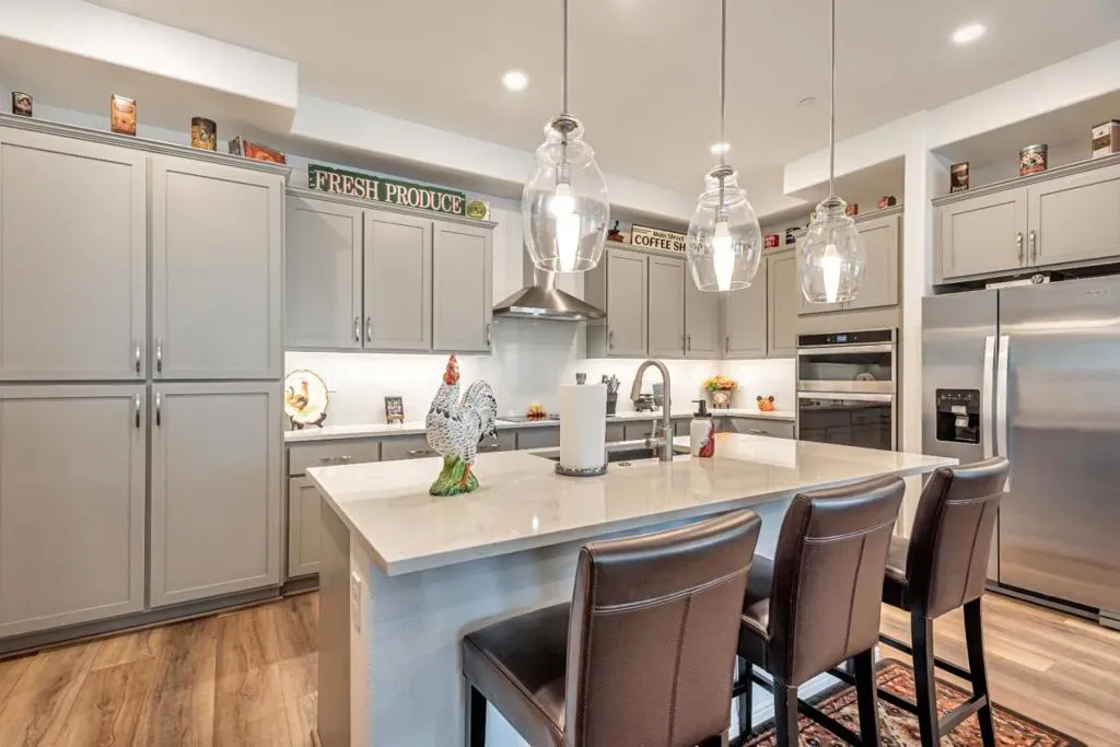 This remarkable single-level condominium offers nearly 1,800 square feet of well-designed living space. The residence includes three generously sized bedrooms and three full bathrooms, featuring two elegant ensuite arrangements. Throughout the home, high ceilings contribute to an open and expansive ambiance, while individual ductless heating and air conditioning units in each room ensure optimal comfort for every resident. The contemporary kitchen is appointed with sophisticated gray shaker cabinetry, complemented by stone gray and white countertops for a polished aesthetic. Seamlessly integrated into the adjoining dining area and living room, the layout is ideal for hosting gatherings. The expansive breakfast bar enhances both the utility and appeal of the space, offering additional seating and serving options. Notable amenities include a rooftop entertainment area for social engagement and relaxation, as well as an elevator for effortless movement within the building. Additional conveniences consist of an in-unit laundry closet, and a two-car garage, complete with ample storage space. Property is now vacant. Photos were taken when the owner occupied.