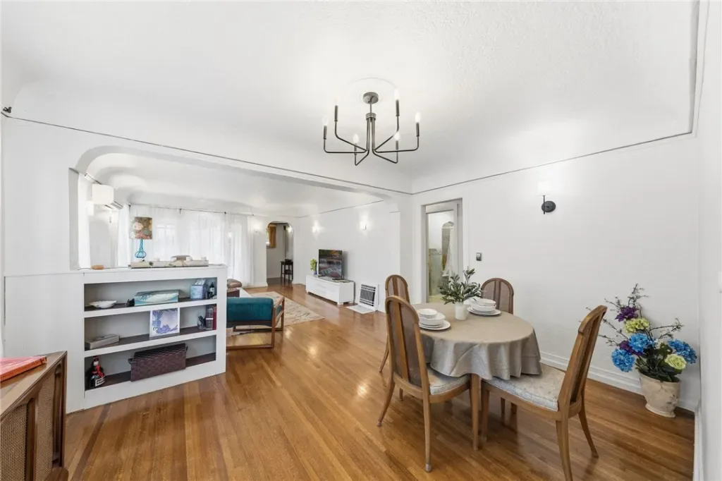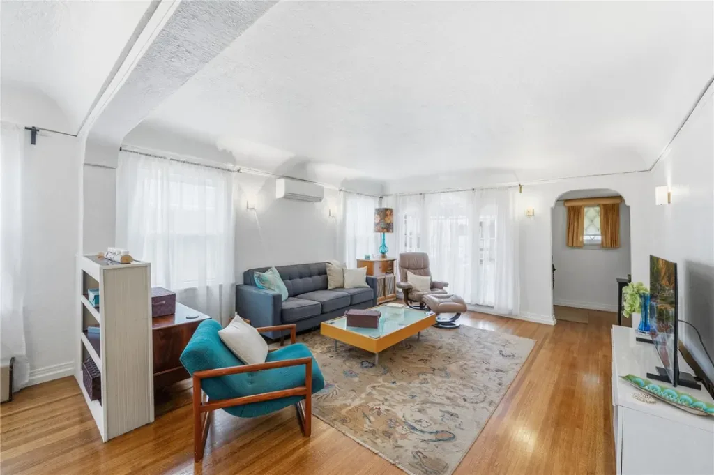 Featuring 3 bedrooms, 2 bathrooms, and approximately 1,320 square feet of living space, the home showcases original mahogany hardwood floors, crystal doorknobs, and new interior paint throughout. Step into a cozy living room that flows seamlessly into the dining area, creating an inviting space for everyday living and entertaining.