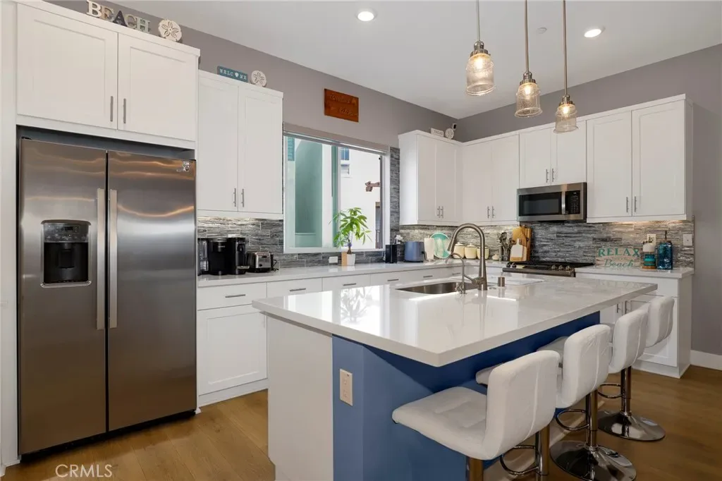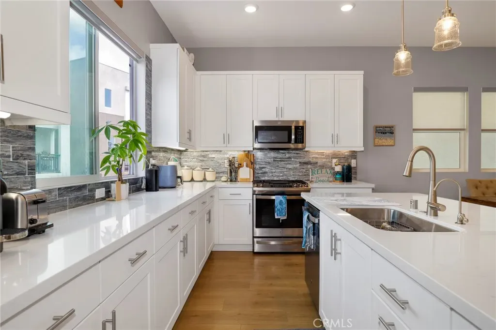 Nestled within the highly desirable gated Ponte Vista Master-Planned Community of Coastal San Pedro, 1642 W Saratoga Lane is a top of the line Plan Three, 4 Bedroom and 3.5 Bath, 1873SF Detached Tri Level Home and offers the perfect blend of modern design, thoughtful upgrades, and a vibrant coastal lifestyle. This beautifully enhanced and upgraded residence combines comfort and sophistication with a numerous list of improvements, making it truly move-in ready! Step inside to find a custom painted designer interior that compliments the home’s bright and inviting layout. The kitchen has been updated with a new designer tile backsplash, quartz countertops, spacious center island with seating for 4 bar stools, white shaker cabinets, stainless steel appliances, chic pendant lighting & pantry. The upgraded living room light fixtures set the tone for stylish open entertaining with outdoor covered patio for BBQ! The bathrooms have all-new lighted mirrors, modern glass shower doors, and a newly installed full size vanity in the mid level power room, adding both function and elegance. Upstairs, the primary suite shines with updated lighting, custom closet organizers, and new roller window blinds throughout for a polished and tailored feel. Luxurious shiplap accent walls in two upstairs primary bedroom suite and lower junior suite which brings warmth and coastal flair to the sleek design. Durable LVP laminate flooring on the lower staircase and throughout the main level enhances the home’s flow, while stackable washer and dryer closet on the main level and thoughtful custom storage solutions—including ceiling-mounted garage racks and epoxy-coated garage flooring—add everyday convenience. This residence also embraces sustainable living with owned, not leased, SunRun 9 panel solar energy system, Central HVAC with electric heat pump and the convenience of a newly installed Tesla Universal Level 2 EV Charger in the spacious two car attached garage. Situated just minutes from coastal trails, PV resorts, and charm of San Pedro’s waterfront, Ponte Vista offers resort-inspired amenities and a true sense of community featuring a large in-ground community swimming lap pool and spa, firepit, outdoor BBQ area & lawn, fitness center and hiking trails. Every detail of this model home has been carefully curated to deliver stylish coastal living at its finest. Close to I-110 Frwy local restaurants and retail shops in the Rancho Palos Verdes Western Avenue Corridor. A Must See!