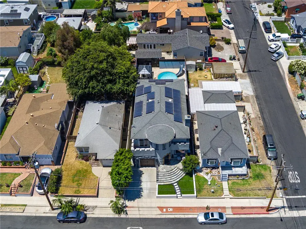 The backyard is a private, resort-style oasis featuring a heated pool and hot tub, outdoor lounge with a covered TV area, built-in BBQ island with refrigerator, and solar panels to help offset energy costs.